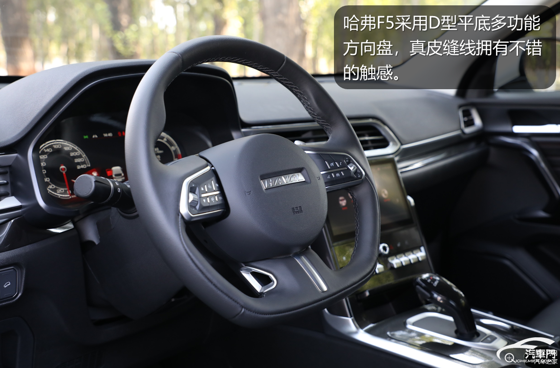 哈弗F5采用D型平底多功能方向盘,这种设计在哈弗很多车型中使用,真皮缝线拥有不错的触感。上边设有定速巡航和语音控制按键,同时方向盘下方还设有换挡拨片,运动元素不断叠加。