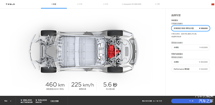 Model 3(指导价:32.8万元)标准续航升级版 续航里程460km 最高时速225Km/h 百公里加速5.6秒