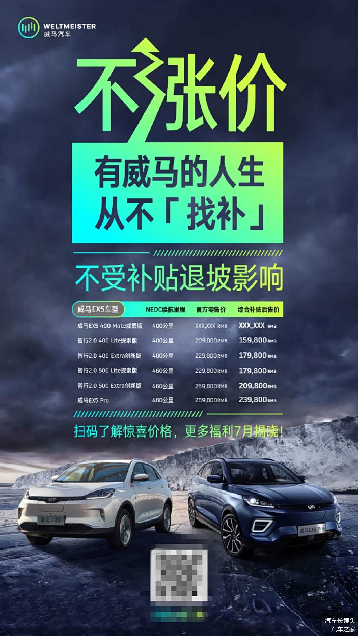 应对补贴政策退坡,有像小鹏一样还没想好对策的,但是自然也不乏反应快的车企,威马便是其中之一。6月25日一早,威马就在微博、微信等各大平台直接贴出EX5“不涨价”的海报。除了原本售价12.98万元的最低配车型“300 Entry发现版”被替换成了13.98万元的“400 Mate威盟版”,其余车型全部保持政策退坡前价格继续销售。作为新势力中最早走亲民价格路线的车企之一,从产品定位到销售政策,威马汽车一直以来都贯彻着让用户“用得起 用得爽”的理念,尽管EX5刚上市时有人说威马在破坏市场,但威马还是用每个月稳定千台的销量进行了有力的反击。85家智行合伙人、覆盖57个城市以及在“网约+新零售”模式的探索上,都将为威马品牌快速提升存在感。当然,回到消费者层面,在几乎所有新能源车都价格回弹之时,如果还有车能保持此前的补贴价格,而且配置还不错,谁会不动心呢。