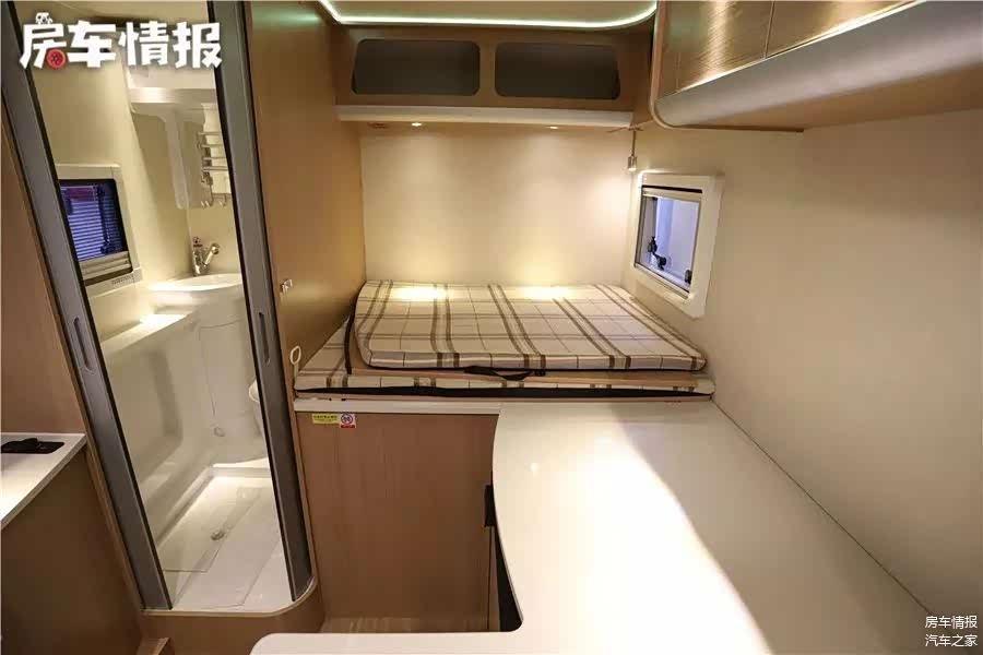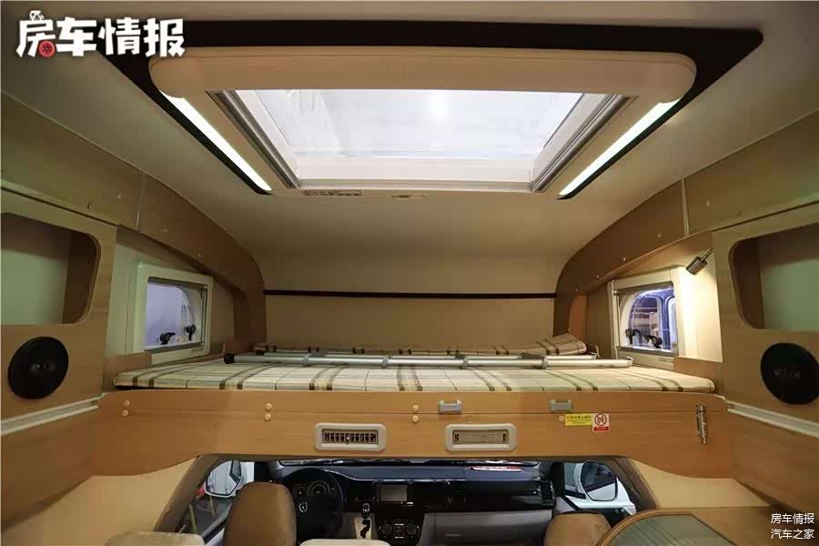 车辆的驾驶室上方为一张额头推拉式双人床,空间相当大,睡两个人也是绰绰有余,床头部它还配有阅读灯方便乘客晚间使用。它的上方为一个大型天窗,左右两侧还配有外推窗,充分保障了车内的光照性以及空气的流通性。同时在车尾部的右侧,还有一张可拓展式纵向双人床,上方配有储物吊柜,这样算下来车内睡上四个大人两个儿童是完全没有问题的。