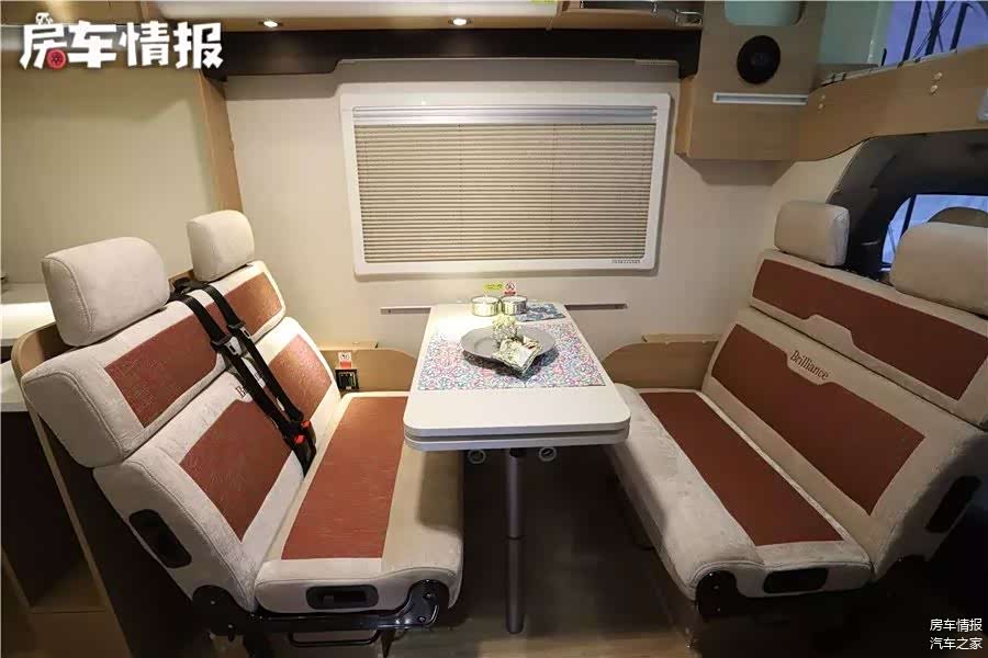它的内部空间还是比较宽敞的,我们先来看一下会客区。会客区位于车厢中部,座椅采用对坐卡座形式,中部为一个可拆卸餐桌,将餐桌拆卸,座椅旋转放倒后,此区域也可变成一张双儿童床,可供两名小孩休息。会客区的上方为一排空间较大储物柜,右侧为一张单人沙发,可供乘客在驻车后使用,上方是一台24英寸的可旋转电视。