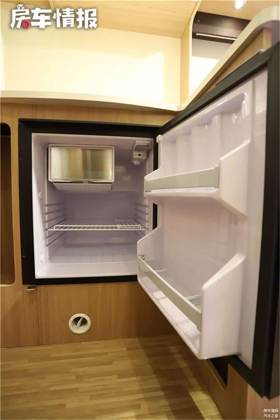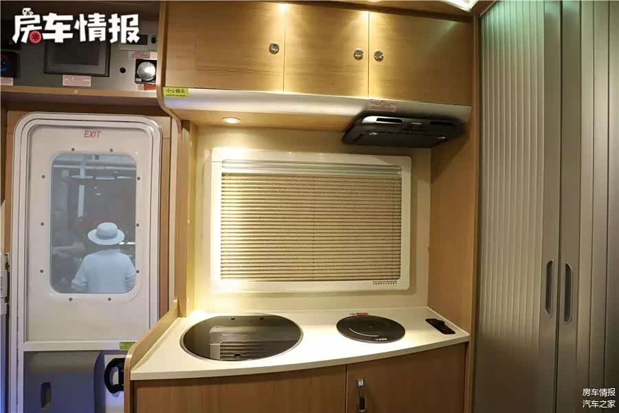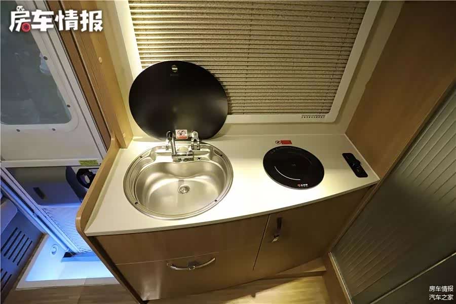 厨房位于车门的左侧,配有带盖式不锈钢洗菜盆,电磁炉,吸油烟机,橱柜,以及隐藏式65L电冰箱,完全可以满足日常做饭的需求。