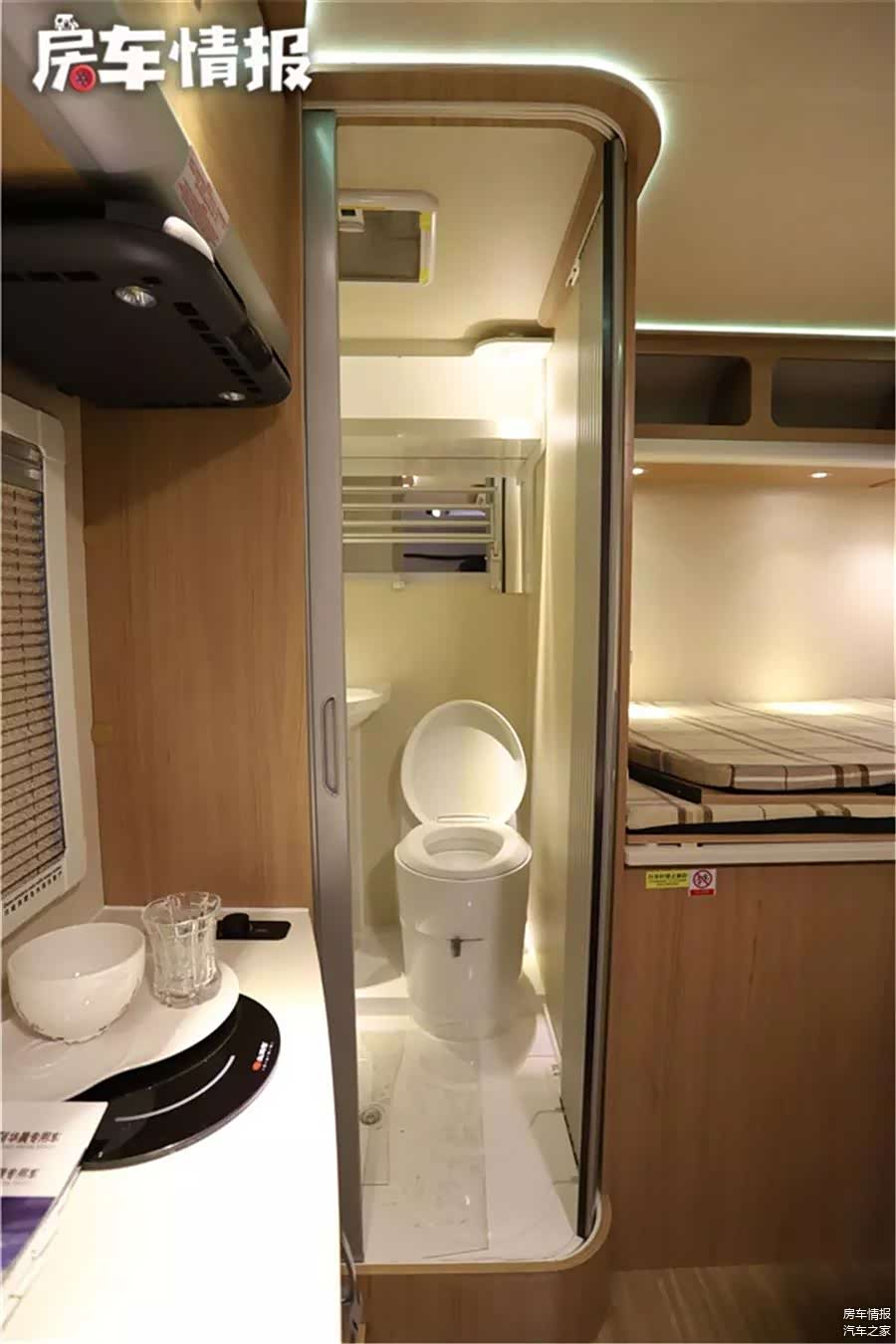 车尾的左侧为一个一体式卫浴间,空间相对于其它房车来说算是很大的了,设施也相当齐全,配有淋浴底盆及淋浴设备,盒式坐便器,洗手池,梳妆镜,毛巾杆以及卫浴排风扇。