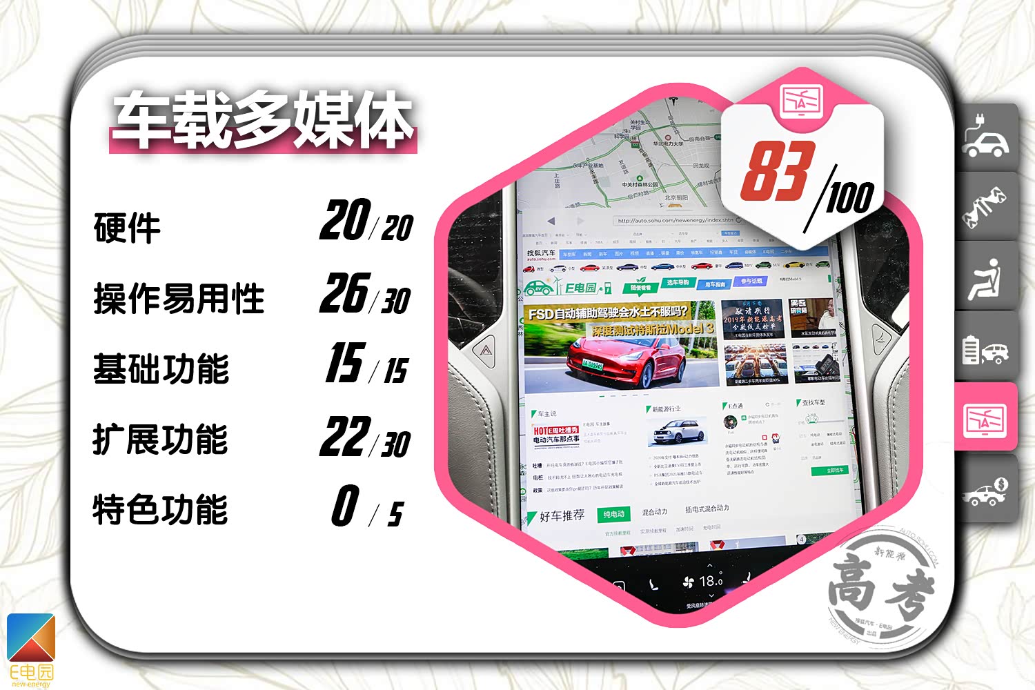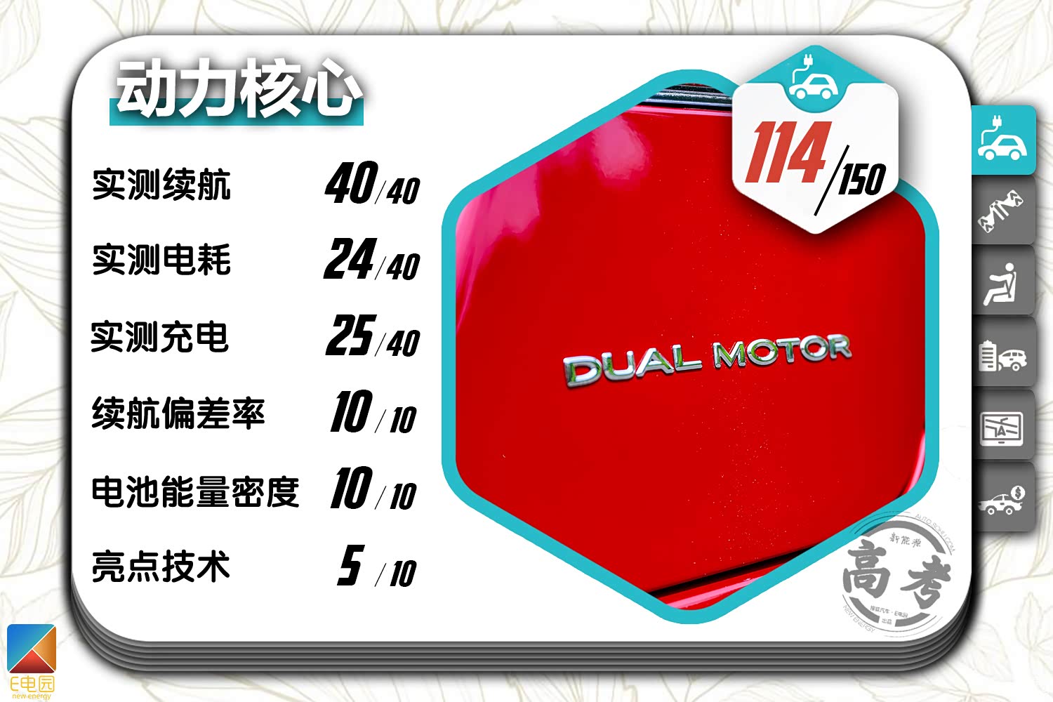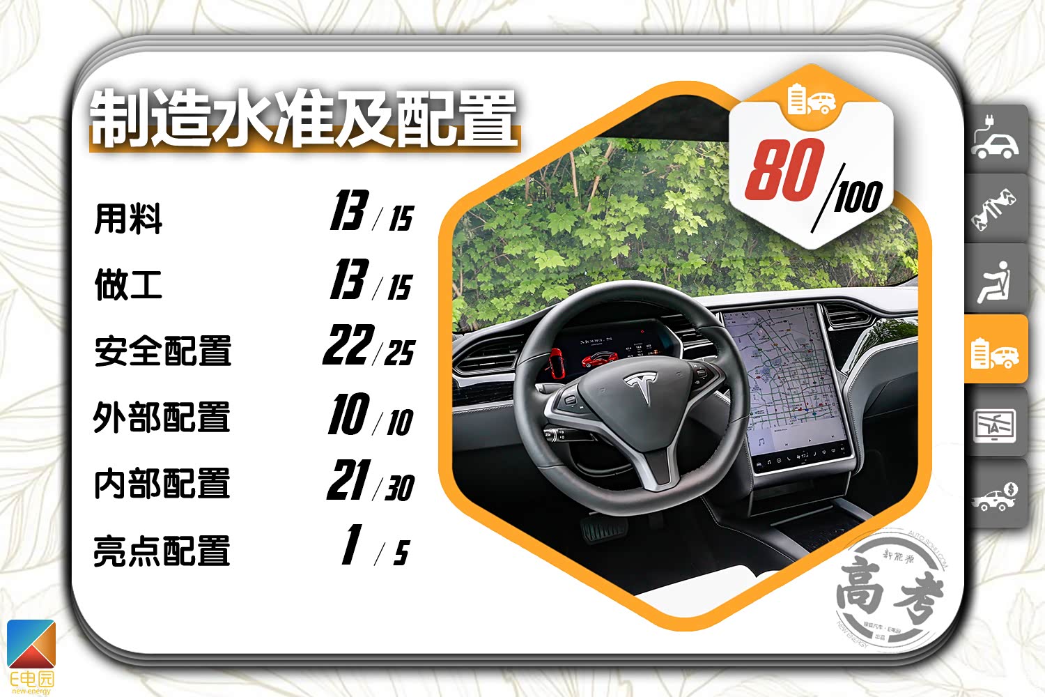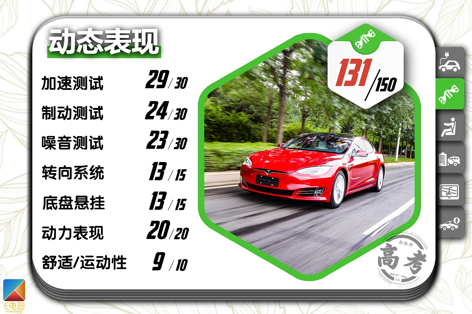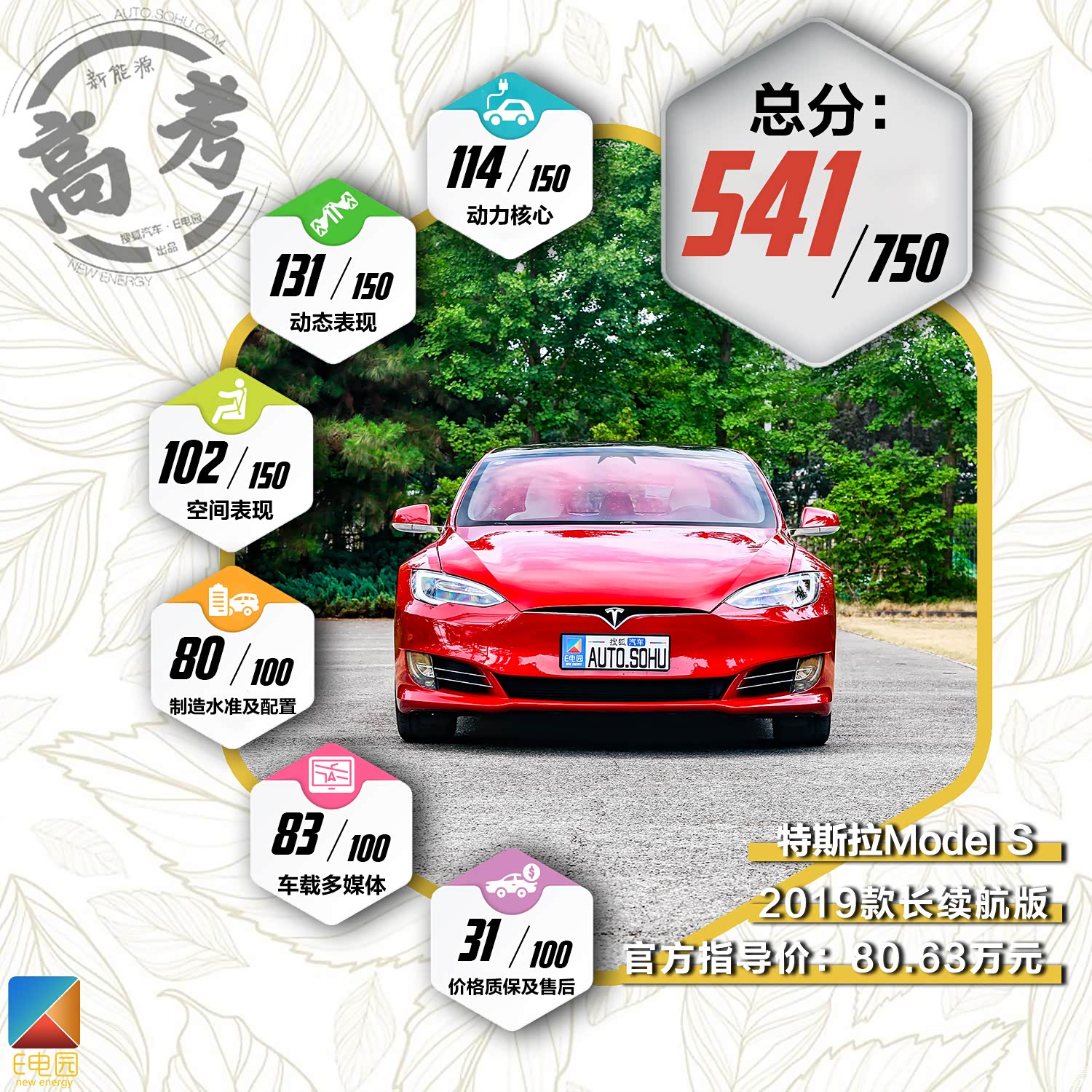 在搜狐汽车·E电园《新能源高考》评测体系中,2019款特斯拉Model S长续航版的最终得分为541分。具体到每项来看,Model S长续航版在各方面的表现都较为均衡,尤其是在动态表现以及车载多媒体部分,其得分都处于顶尖水准。而受制于较高的售价以及后期保养成本,其在价格质保及售后部分的得分仅为31分,这也使得其总成绩并未能领先于所有纯电动车。