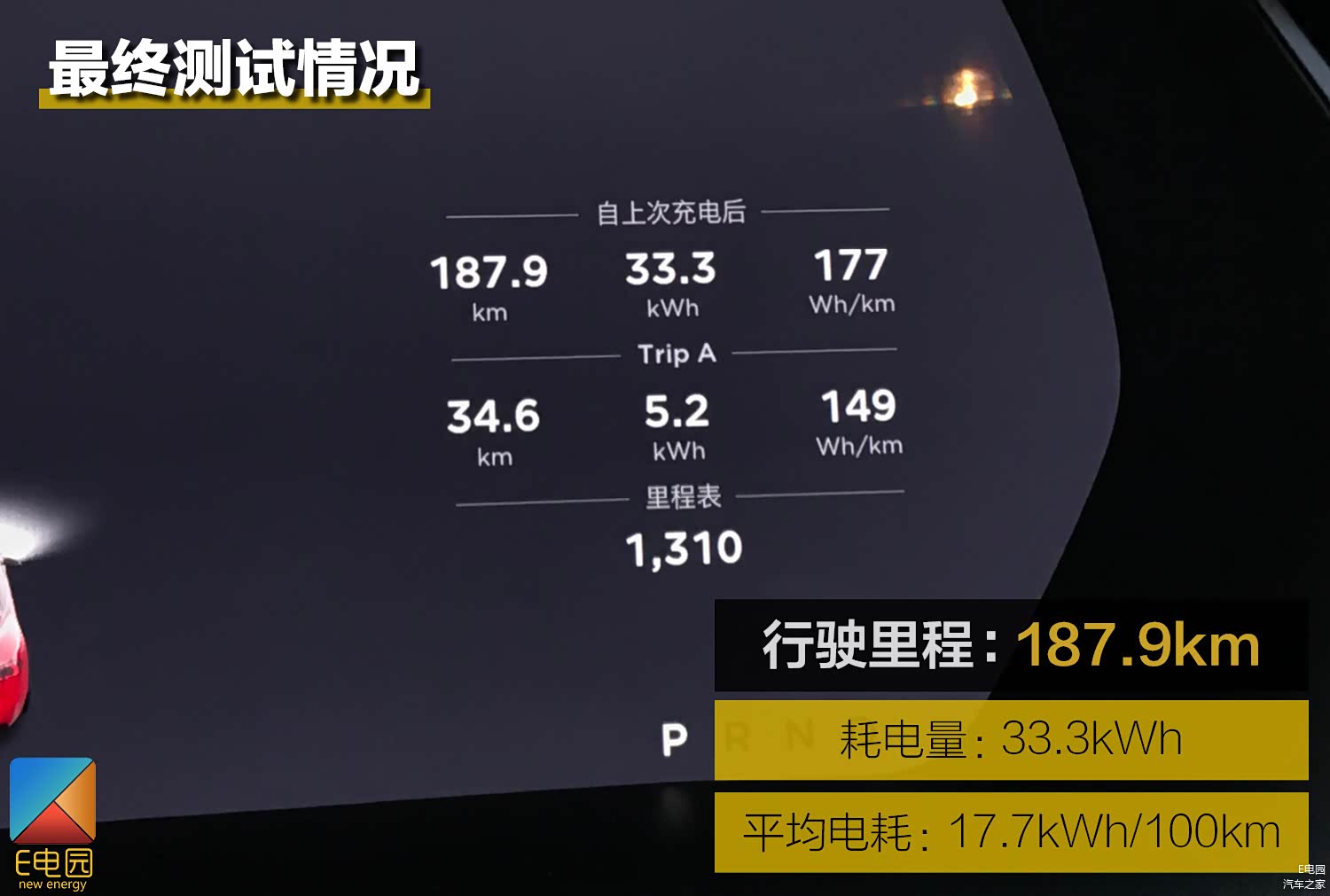 好了,在看完测试规则后,下面我们来看看Model S长续航版的实际续航里程表现。在测试过程中,全程车内乘员1人,空调温度为21度,风量3挡,最终经过187.9km的行驶后,车辆共消耗电量33.3kWh,由此能够得出Model S长续航版的实际续航里程为564km,续航偏差率仅为14.5%。