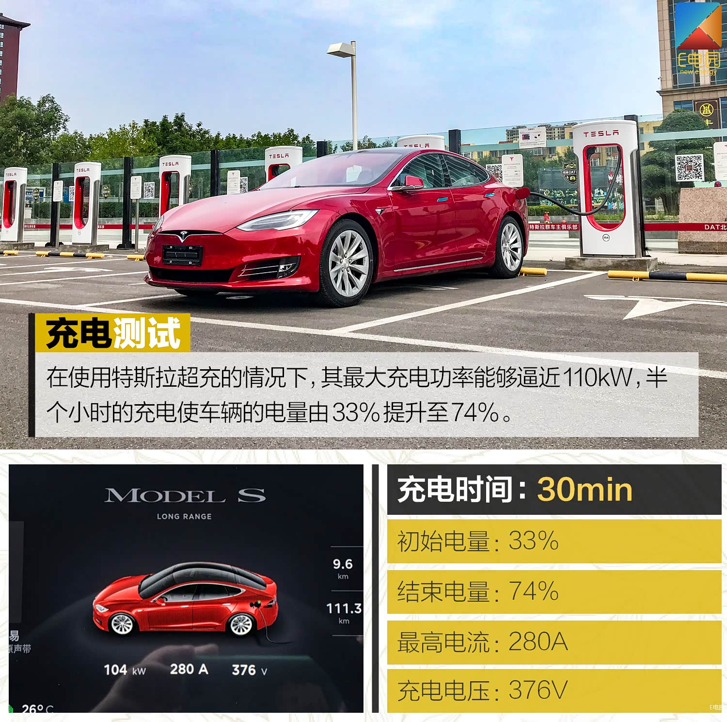而其在超级充电桩上的表现则符合我们的预期水平,在使用特斯拉超充的情况下,其最大充电功率能够逼近110kW,电流也达到了惊人的280A,半个小时的充电使车辆的电量由33%提升至74%,充电效率喜人。不过其充电功率也会随着剩余电量的增加而逐渐衰减,70%电量之后,其功率会回落至60kW左右。