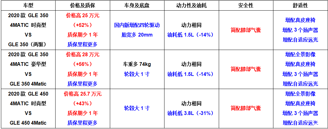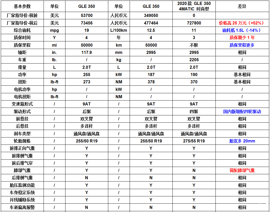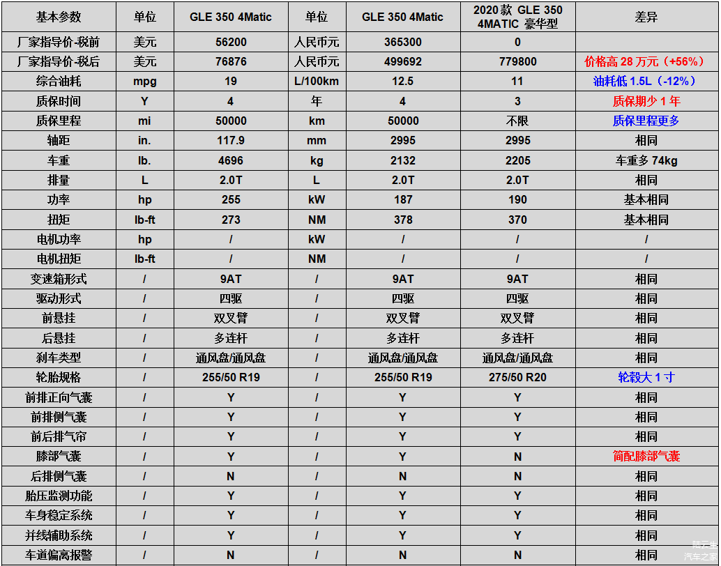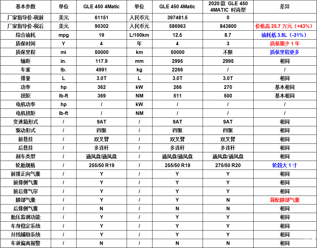 为了让读者更加深入了解2020款GLE在中国市场和美国市场的配置差异,我们选取3个动力接近的配置(上表灰色部分)作为详细对比: