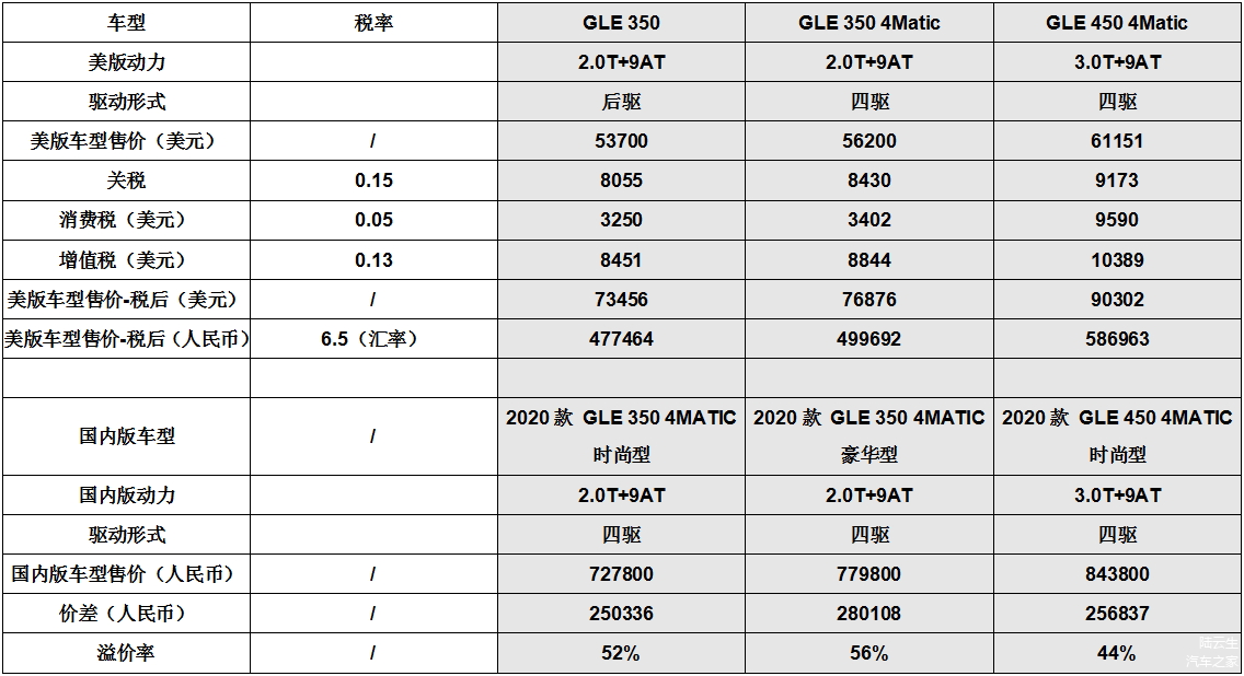 由上表可见,国内版和美版2020款GLE各有3款车型。动力系统方面,美版和国内版均采用2.0T+9AT动力总成,做到了中美一致。价格方面,国内版GLE的指导价远高于美版折算价,溢价率达到了50%以上。
