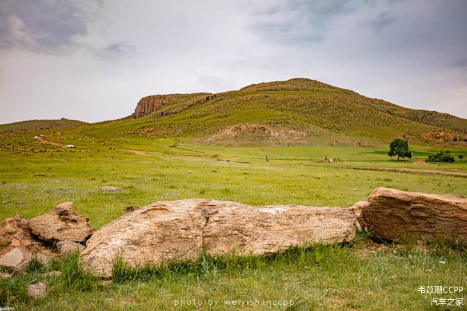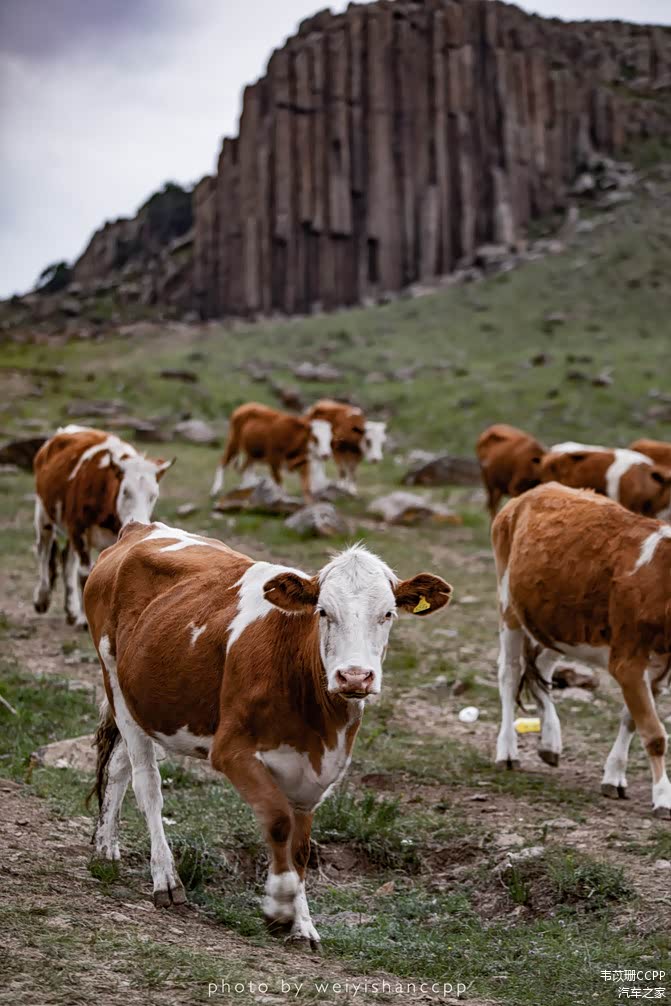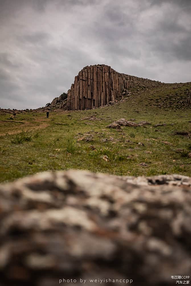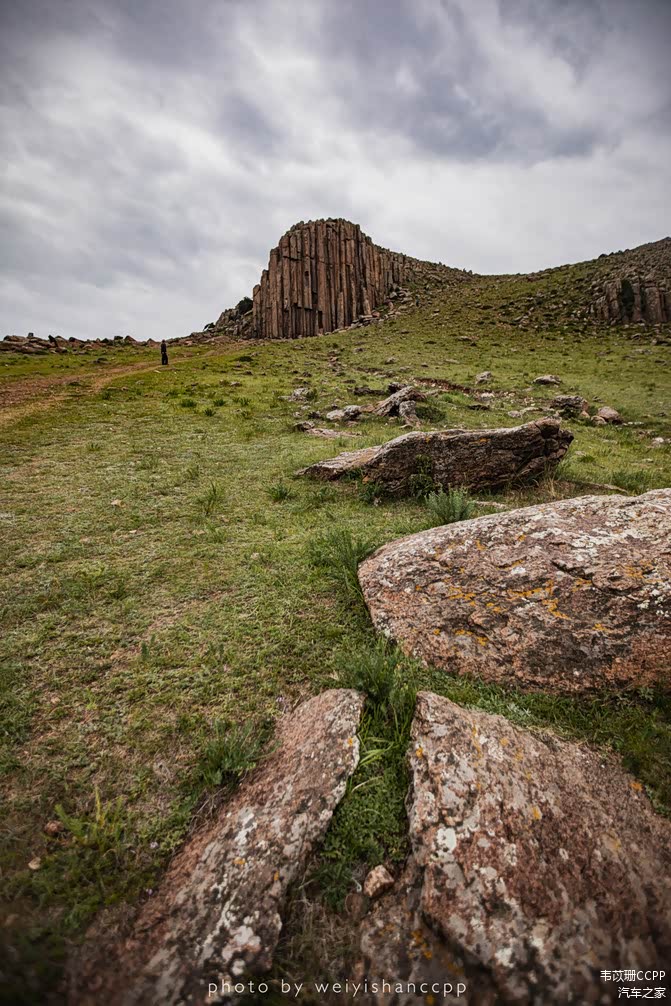 石条山是一个由岩浆凝结而成的玄武岩石柱,根根石条镶在一个小山包山。目前这个地方没有什么管理,就是为了防止汽车碾压草场,在山下围了一圈石头,想要上到泥路上需要过一个小沟,我们的轿车是过不去的,开SUV的同学可以随意。这个时候天已经下起了微雨,但是为了这个已经等待了上亿的石条,我们还是决定徒步走上去!