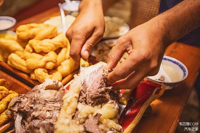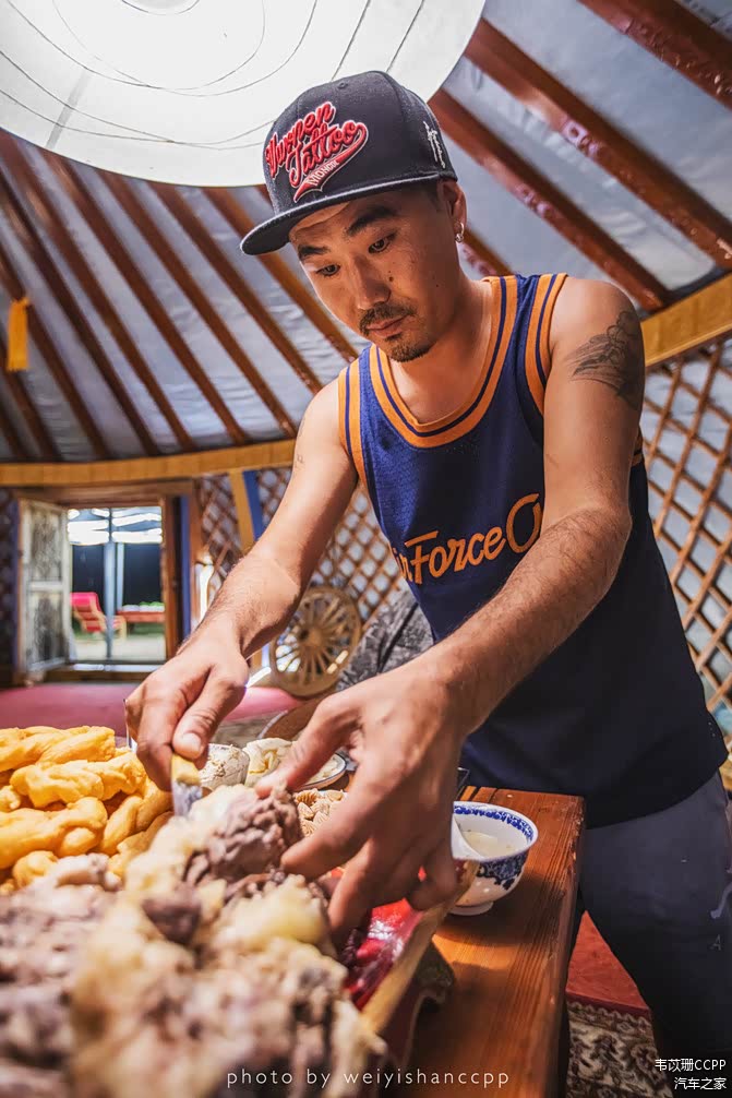 在蒙古包里手把肉、奶茶,内蒙特色吃起来,为我们切肉的这位就是帅气的老板,手扒肉非常鲜美,一点膻味都没有,在场的男人还尝试了一下全肥的肉,那口味,据说很上头哈哈。
