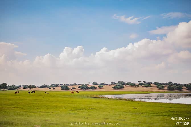 在沙地的另一边,有成群的牛、羊、马,他们在悠闲地吃草喝水,黄色和绿色交融的场景下特别美。