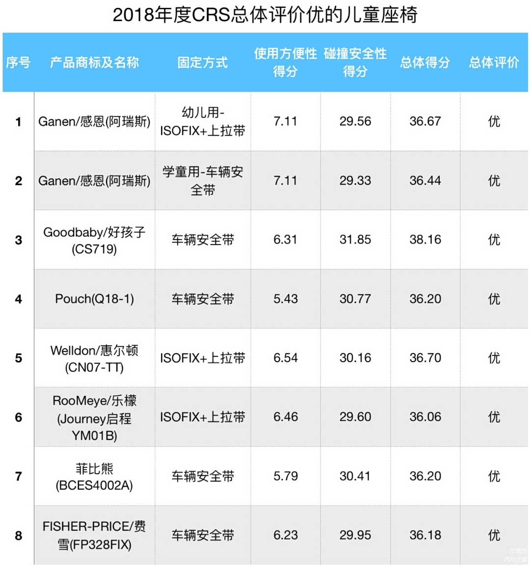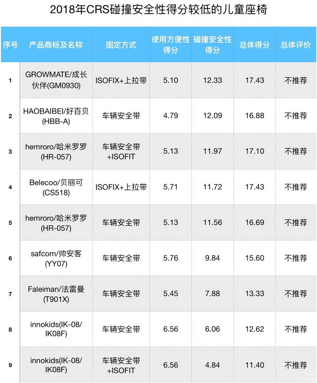 下图里的表格,一张是2018年所有总体评价获得“优”的儿童座椅;另一张是2018年碰撞安全性得分排末尾,且总体评价“不推荐”的儿童座椅。
