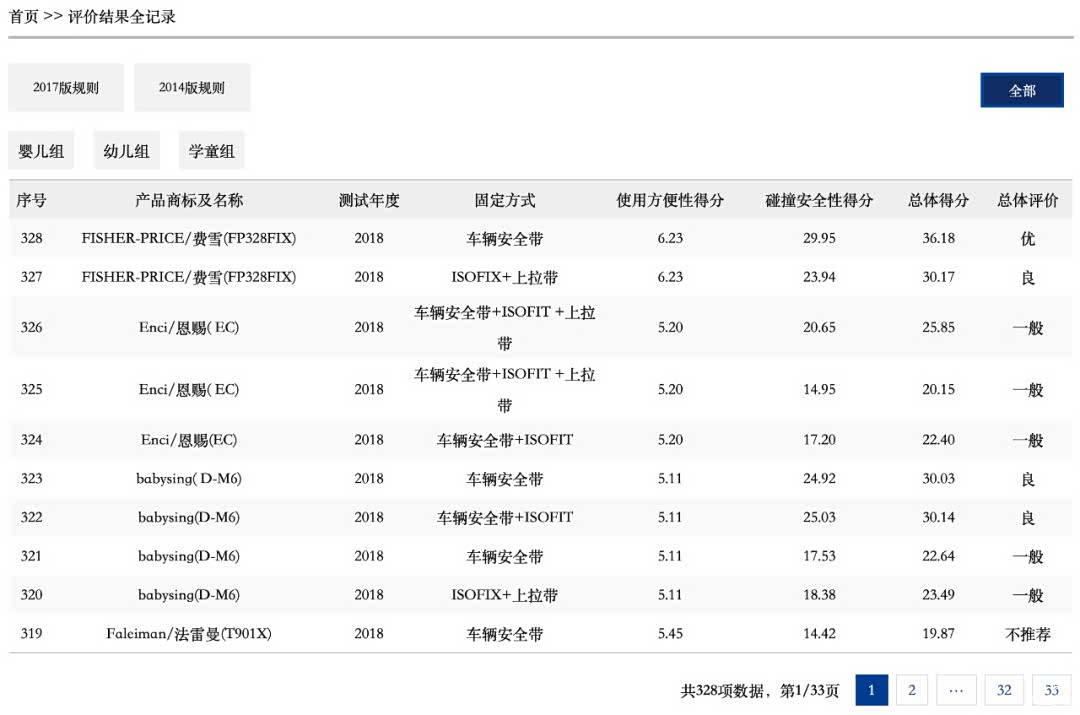 从2014年9月22日,中国汽车技术研究中心C-NCAP儿童约束系统(CRS)产品评价2014年第1号试验起至今,C-NCAP每年都会抽检一批儿童安全座椅,5年间共计测试了328款(官网公示数据)。