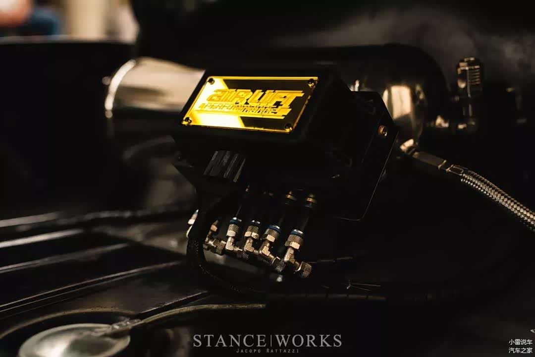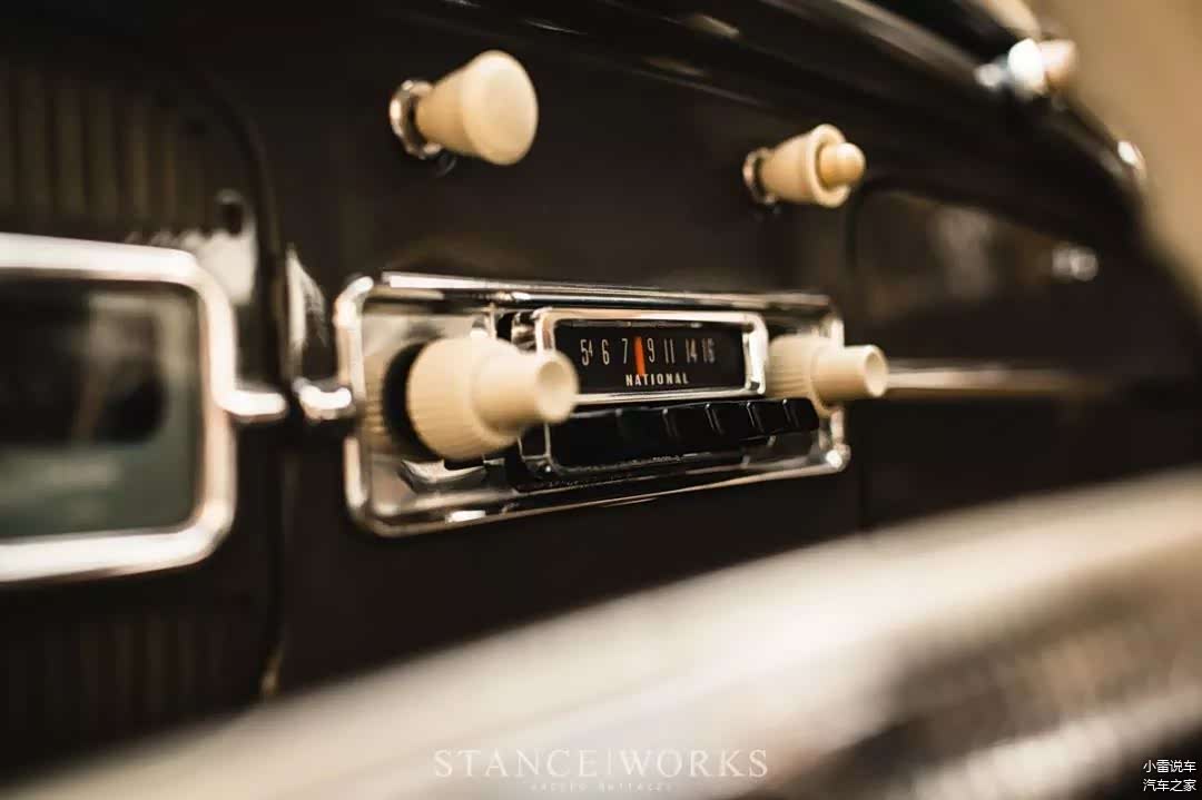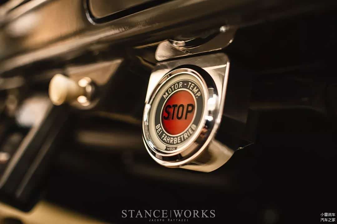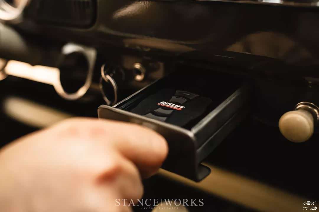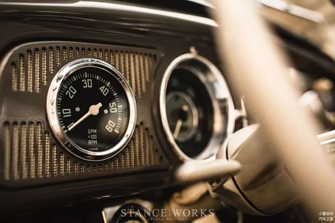 车内,内饰相当完美,原厂的内饰被完整的保留下来,不过我们也能在这台车子上发现有不同的东西,比如原厂1964款的VDO转速表和一对VDO时钟/计时器等。另外,空气悬挂的控制器则被藏匿在原厂的烟灰盒里。