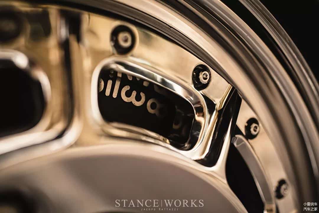 甲壳虫宽大的翼子板下藏着一套定制的造型独特的Felgen Factory三片式轮圈,看起来多了几分原始感,相当惹人注意,而透过轮圈,是一套定制的340mm Wilwood盘式刹车系统。