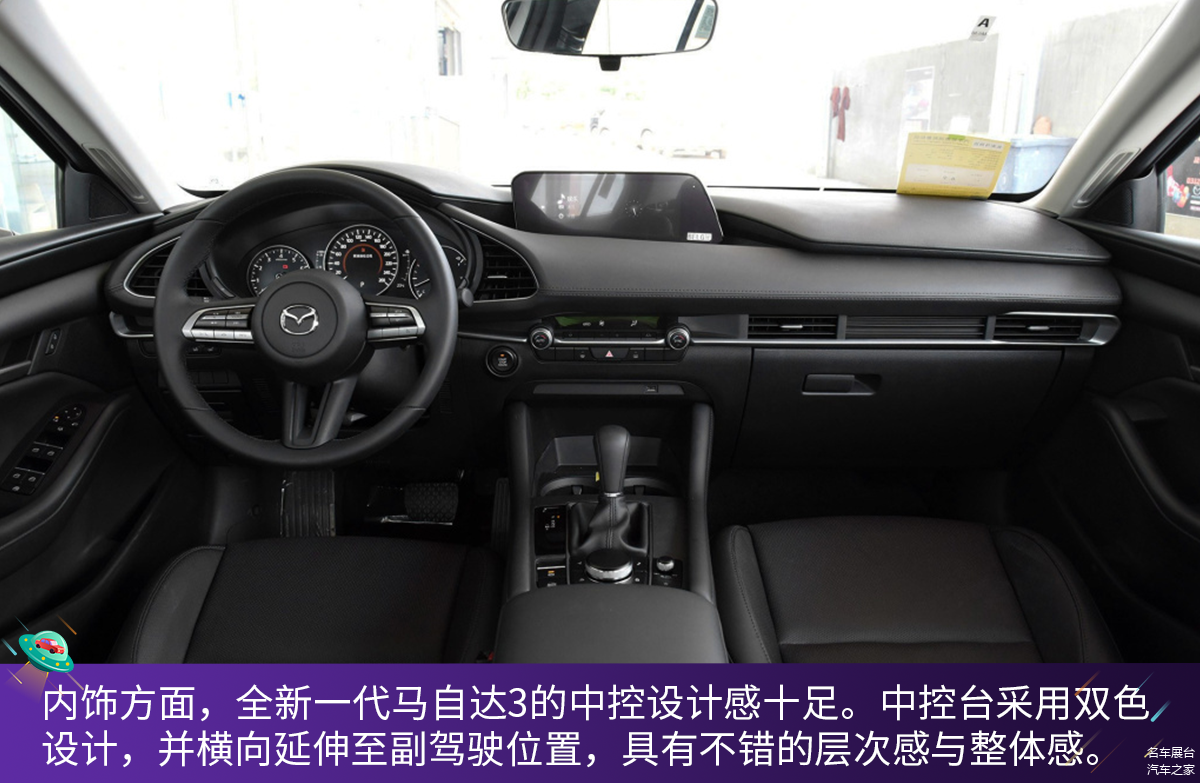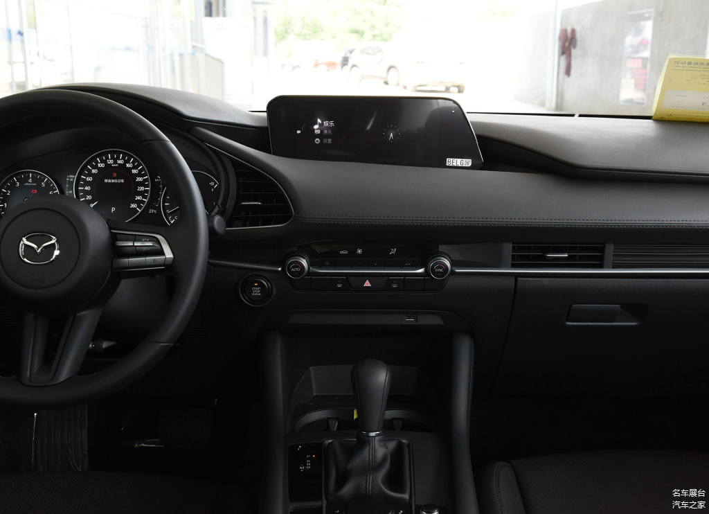 内饰上,马自达可算是保持了一贯的简约风格,干净利落,没有丝毫多余的装饰。可以说是很考验水准。三辐式多功能方向盘,银色按键设计很精致,提升档次,同时内饰氛围整体看起来没那么单调,好评;悬浮式中控大屏也是当下较为流行的设计。