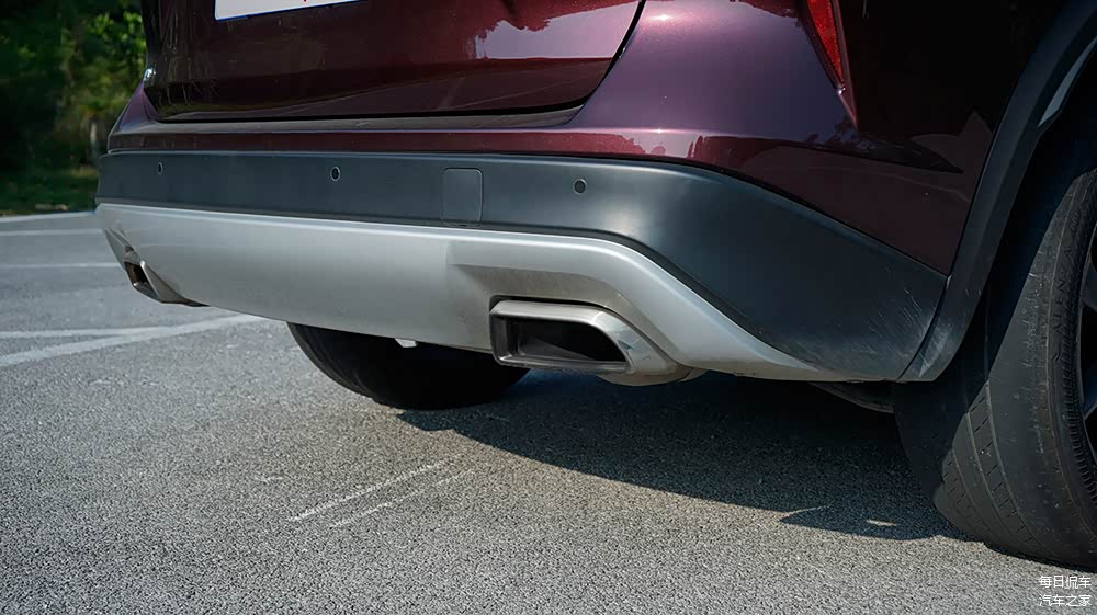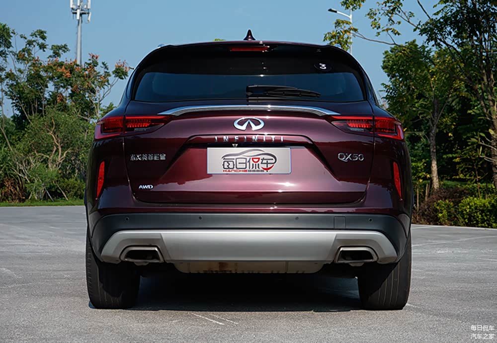 底部采用双边共双出的排气管设计布局,值得一提的是,与普遍车型仅为装饰作用的排气管相比,QX50的排气管是“真实有料”的存在,突出了该车的运动有活力的一面。而且我们可以看到后保险杠拥有丰富的层次,色彩与材质都不相同,看来在形象方面,QX50是舍得下本钱的。