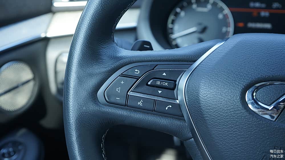 左侧多功能按键为多媒体控制键,右侧则为巡航系统控制键,后方能隐约地看到两块尺寸适中的换挡拨片,满足驾驶欲望。