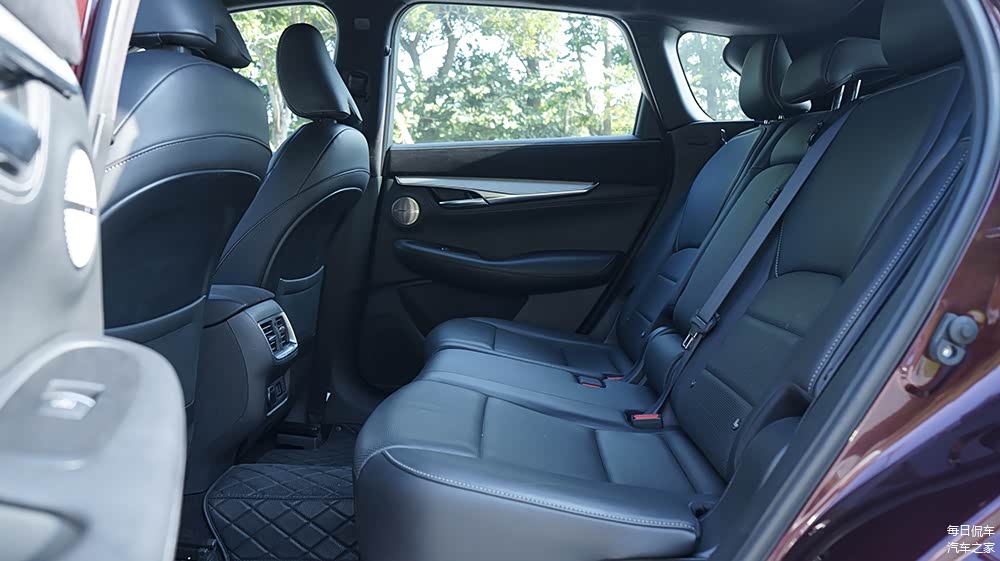 支持4:6比例放倒的后排座椅同样采用真皮包裹,支持前后和靠背角度调节,为后排乘客提供了舒适的坐姿,在舒适度上称得上是同级中的翘楚。虽然QX50的轴距并不算长,但后排的乘坐空间也不显局促,侃弟身高175cm,腿部和头顶空间都比较充裕,横向空间也没有问题。