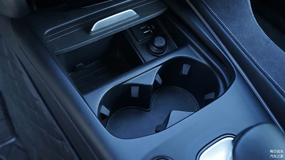 挡杆前方为可开启或关闭的封闭式储物格,内置有小储物格和两个USB接口与12V电源,后方则为两个带有限位器的水杯槽,能满足日常需求。