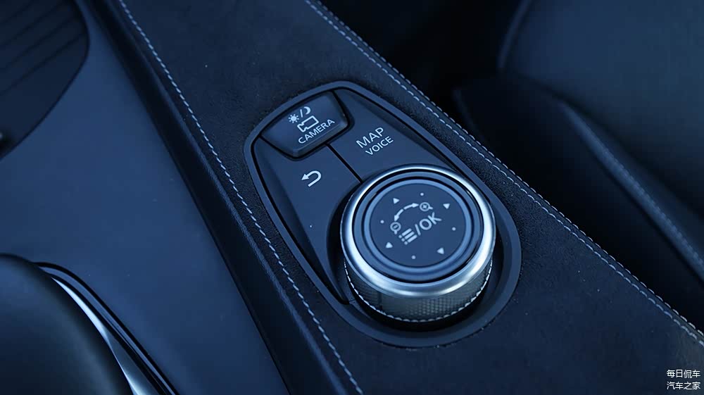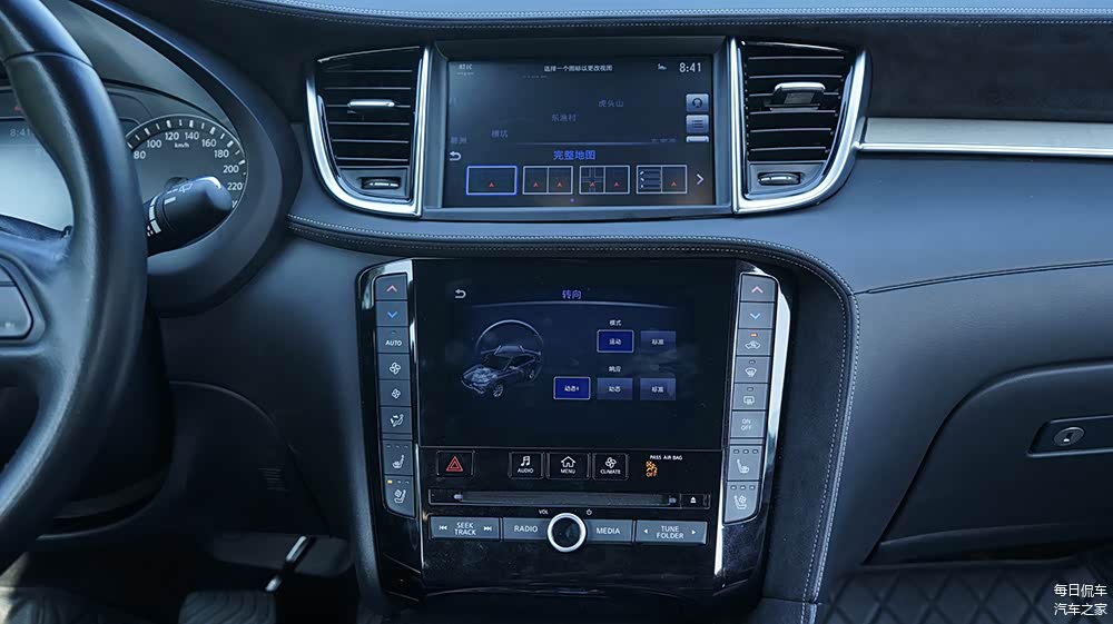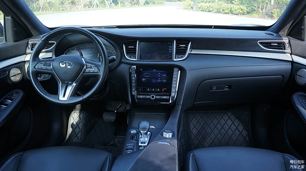 中控台配备有英菲尼迪标志性的双屏设计,同时也是全系标配,非常厚道。上方为8英寸触摸屏,下方为7英寸触控屏,搭载“INFINITI InTouch”人机交互系统。两台中控屏分工明确,上方屏幕负责显示导航、全景影像等信息,下方屏幕则负责显示应用程序、车辆舒适性配置操作界面等。考虑到不同人群的使用习惯,中控屏依旧保留有常用的物理按键,这点还是比较人性化的。不过,使用中我们发现,两块屏幕的触控延时感比较明显,而且UI界面设计的也很粗糙,整体的体验不算好,这点有些拖了整个车厢的后腿,英菲尼迪工作人员表示在未来车型将启动全新的车机系统能够彻底改善。