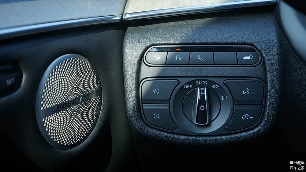 灯光调节采用旋钮+按键的控制方式,左侧是自BOSE品牌的Performance至臻系列的顶级车载音扬声器,全车共设有17个扬声器喇叭,在ANC主动降噪系统和ASE主动声音补偿系统的帮助下,能够提供比较高档的音乐享受。