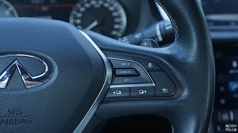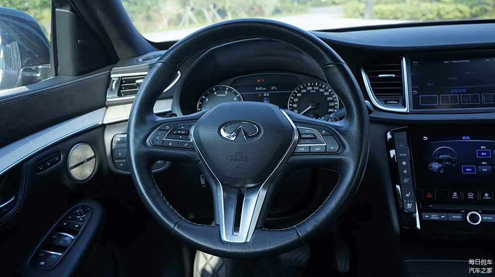 三辐式多功能方向盘采用的是英菲尼迪最新的造型样式,搭配皮质细腻的真皮包裹,带来舒适饱满的握感。方向盘支持上下、前后电动调节以及加热、记忆功能,底部采用镂空的镀铬设计,提升了精致感。