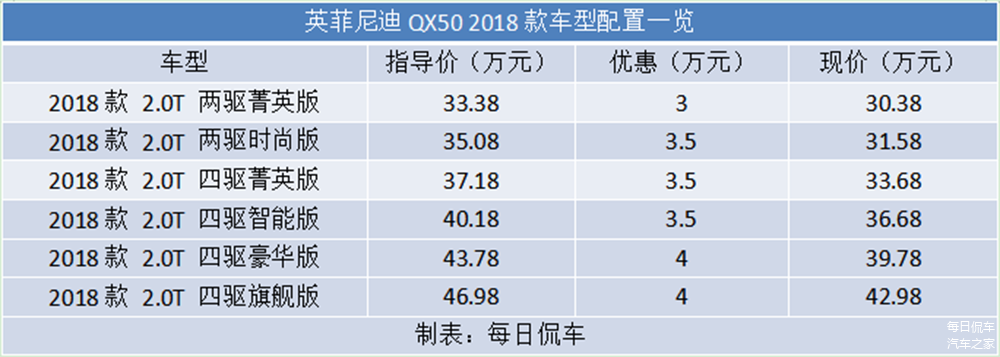 中型SUV市场向来是豪华品牌必争之地,而德系BBA这三架马车拥有绝对的市场份额,不过,车卖得多了也自然失去了个性,对于一些追求自我的用户而言,不考虑品牌因素,性价比更高的二线豪华品牌也是个不错的选择。今天要介绍的主角东风 英菲尼迪QX50(图片 | 参数 | 询价),就是一台富有情调与个性,同时又暗藏实力的车型。现款英菲尼迪QX50于去年6月10日国产换代上市,售价区间为33.38-46.98万元。近日,我们参加英菲尼迪30周年的试驾活动,以版本为2018款2.0T四驱旗舰版(下称QX50)的试驾车为例,一同感受这台车的实力。