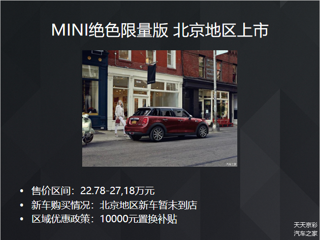 近期,小编从MINI官方获悉,MINI绝色版正式上市,本次共推出3款新车,分别对应三门版/五门版的MINI COOPER(图片 | 参数 | 询价)及三门版MINI COOPER S车型。新车仅售145台,并且使用了十分经典的勃艮第红车漆,展现其独特身份的同时又增添了几分优雅。新车的售价区间在22.78-27.18万元。