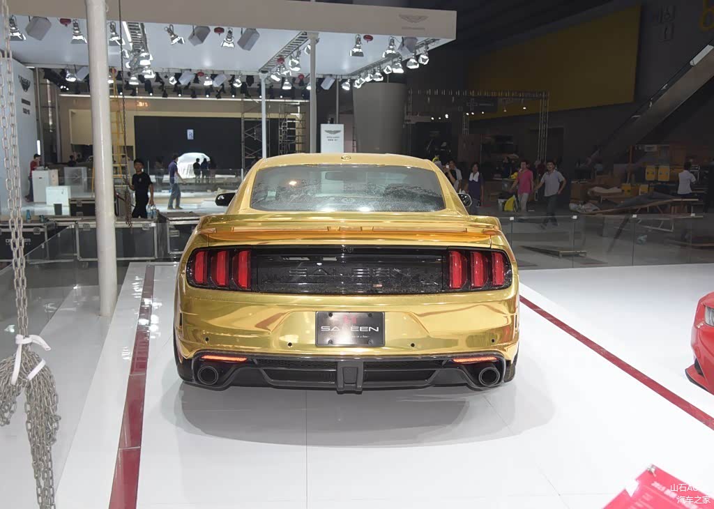 钛金版的野马式一台2015款车型,在外观方面采用了经典的美系肌肉车设计风格,饱满的线条能给人一种力量感,全车采用金色车漆进行涂装,个性张扬,与之匹配的是比较低调的20寸熏黑锻造轮毂,对于一台双门跑车来说,装备这么大尺寸的轮胎会显得格外有气场,车身尺寸方面在同级别车型中也是非常出色的,长款高分别为4783/1915/1331mm,轴距为2720mm。