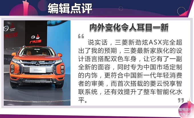 在本届2019广州车展中,广汽三菱旗下的紧凑型SUV—新 劲炫ASX(图片 | 参数 | 询价)正式上市。新车共推出1.6L锋尚版/乐趣版与2.0L活力版/智领版 4款配置车型,官方指导价9.98-13.98万元。姑且抛开新车极具竞争力的价格不谈,或许凭借其全面换新的内外造型,以及丰富的智能化配置,它便可以成为合资紧凑型SUV市场的新宠。下面,我们就来一起看看它吧。