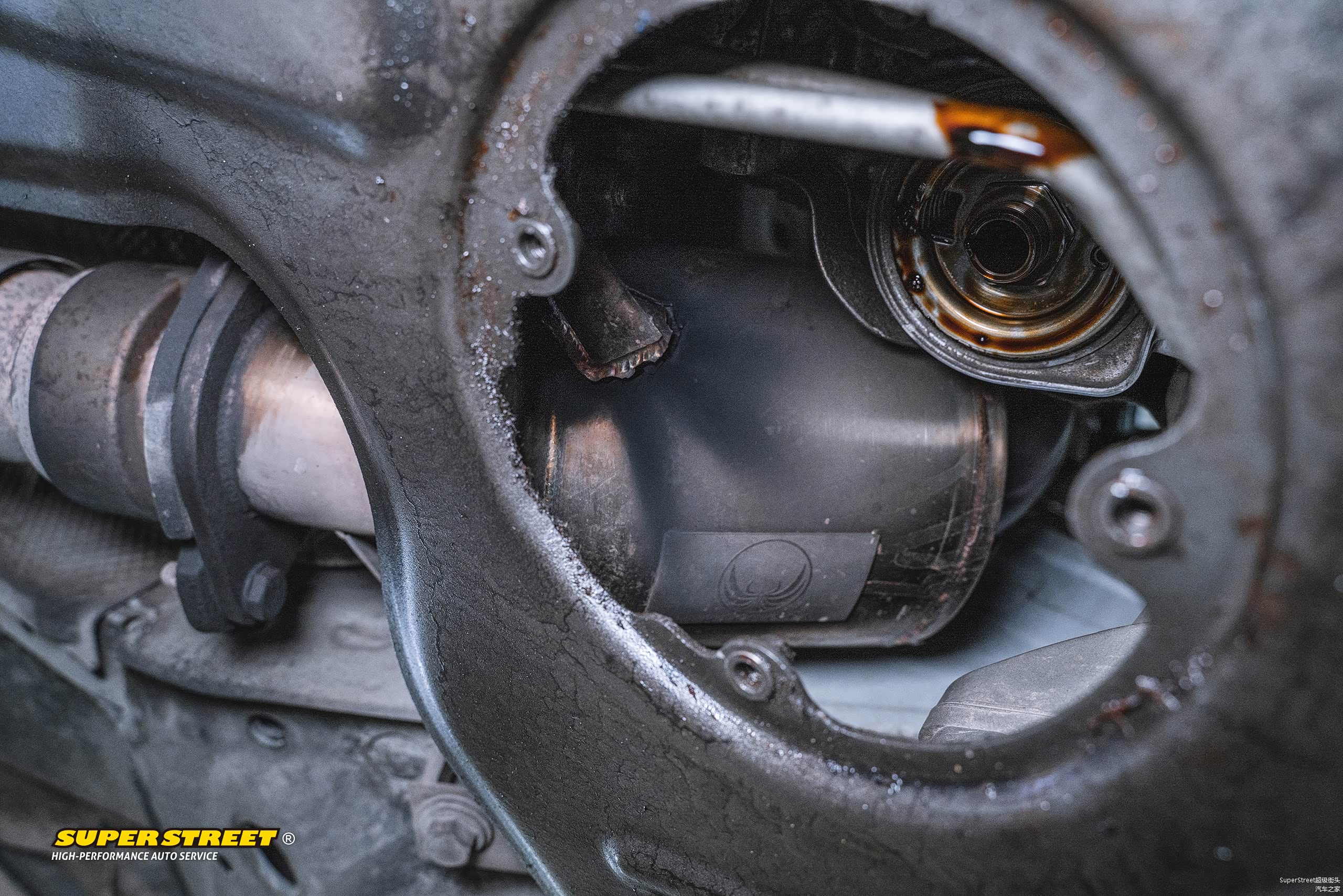 举升车辆后,取下底盘护板,使用专用工具拆卸旧机油滤芯。