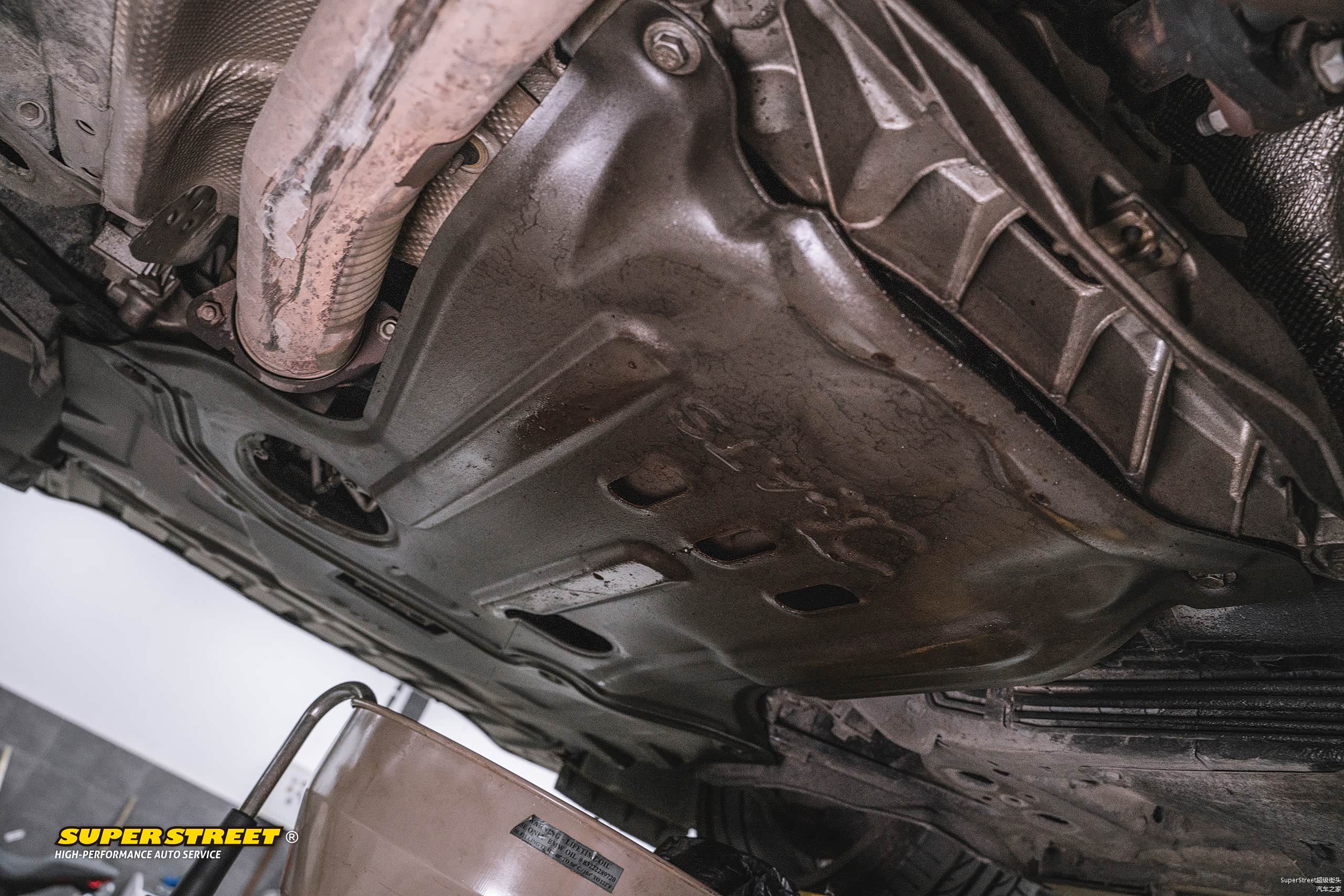 举升车辆后发现底盘有大量的油渍,渗满了整个护板上,我们猜测可能是上次更换变速箱油导致的。
