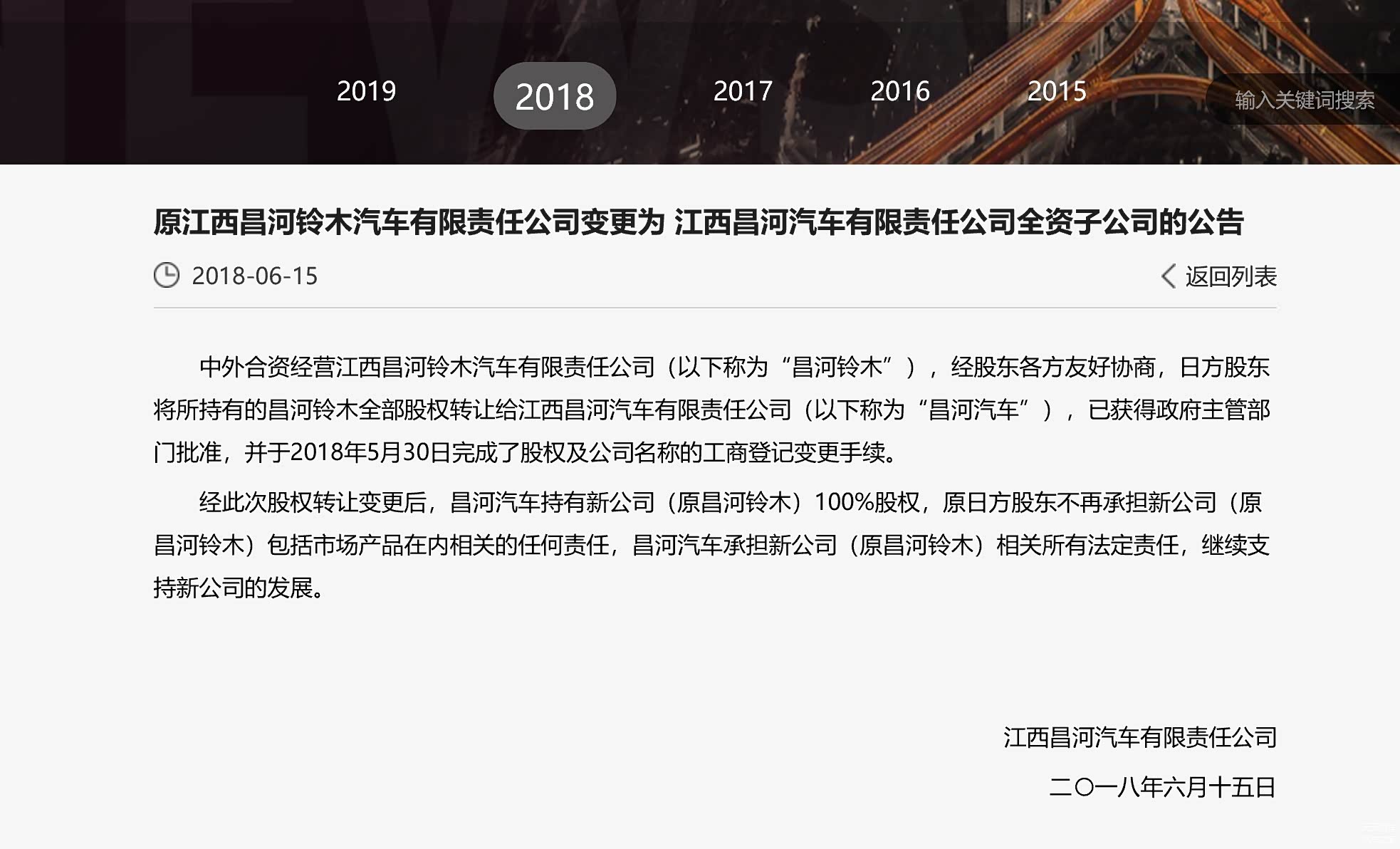 把时间往回拨到2018年6月15日,当天原江西昌河铃木发布公告称,经股东双方友好协商,日方股东把持有的昌河铃木股份全数转让给了昌河汽车,并且后者早在2018年5月30日就完成了股权和公司名称的工商登记变更手续。