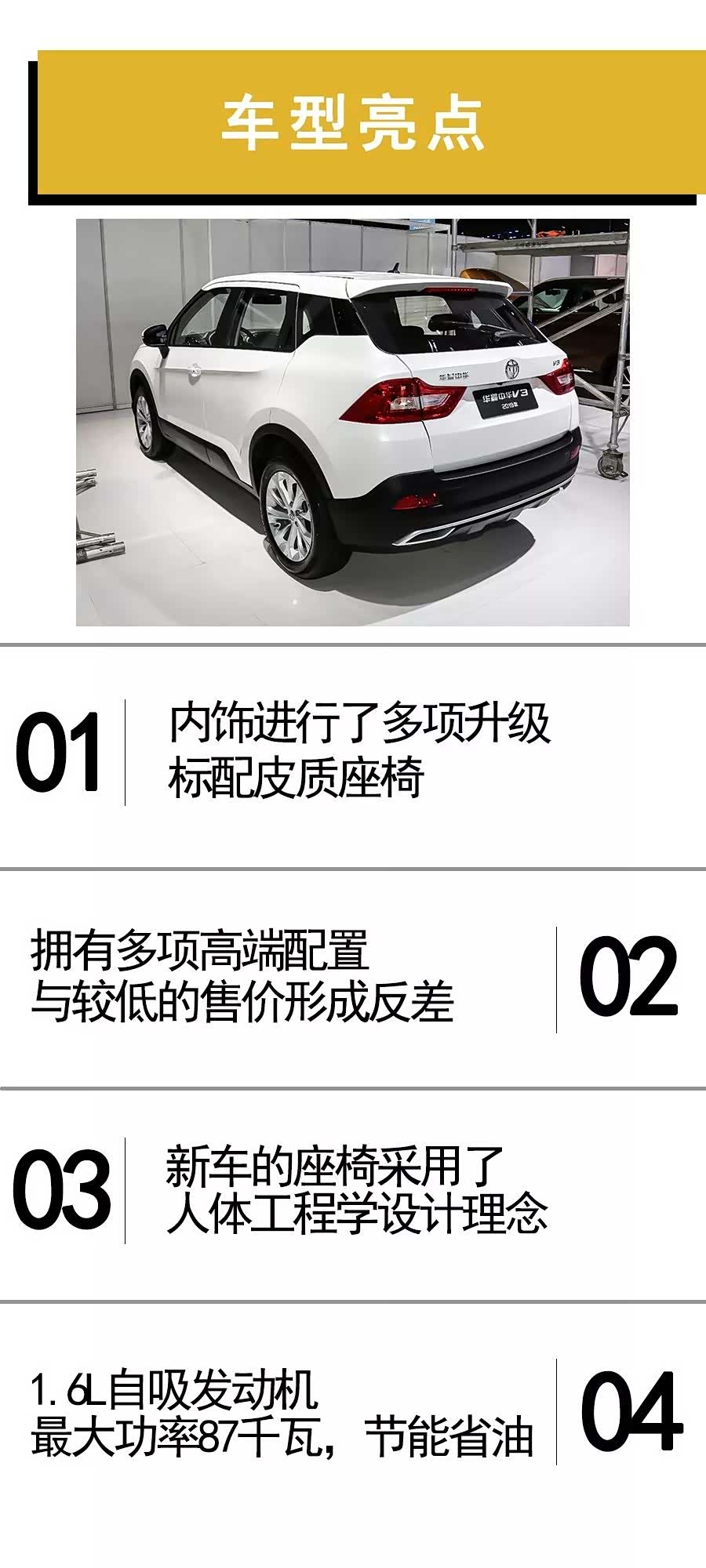 全新中华V3的内饰进行了多项升级,全新的黑色配色比较符合年轻消费者的喜爱,并标配皮质座椅,在保证驾乘舒适的同时,为这款车提升了不少档次感。此外,全新中华V3还拥有全景天窗、雨量感应式雨刷、自动大灯等高端配置,亮点颇多,与较低的售价形成了巨大的反差,非常吸引消费者。