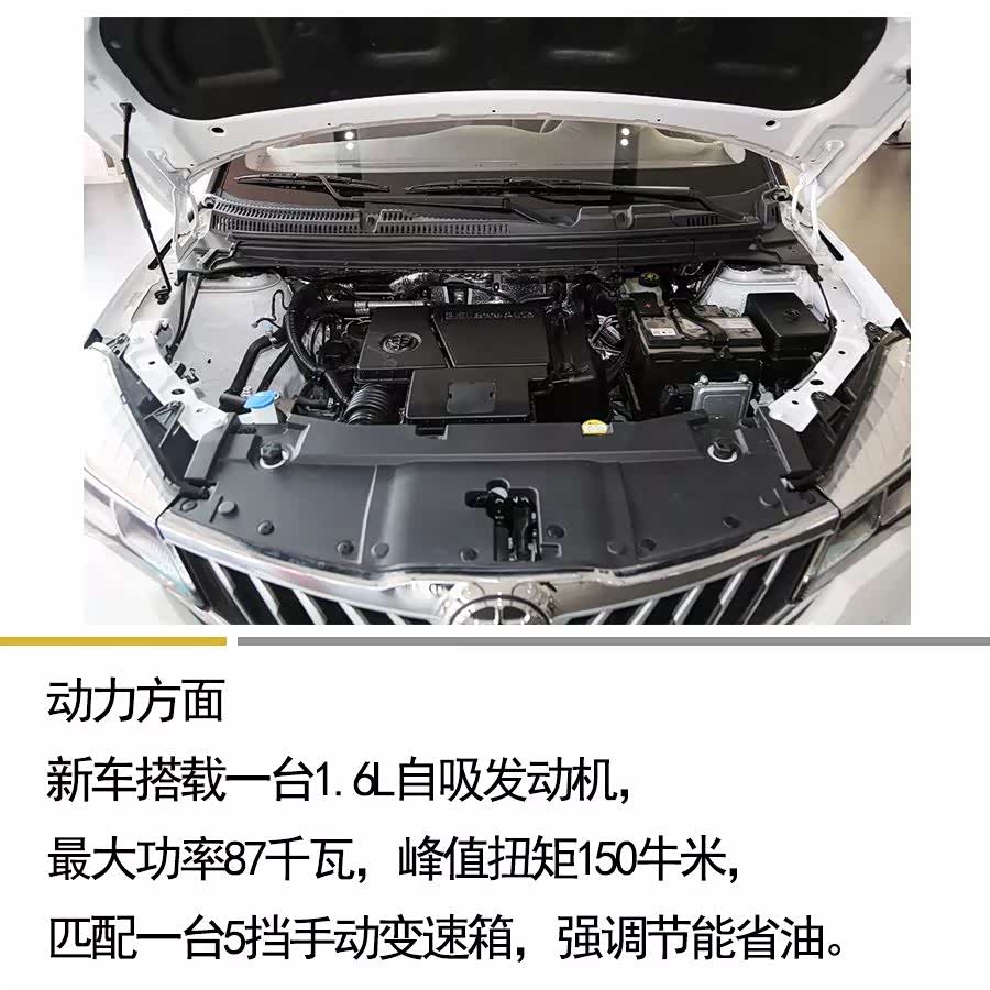动力方面,新车搭载一台1.6L自吸发动机,最大功率87千瓦,峰值扭矩150牛米,匹配一台5挡手动变速箱,强调节能省油。