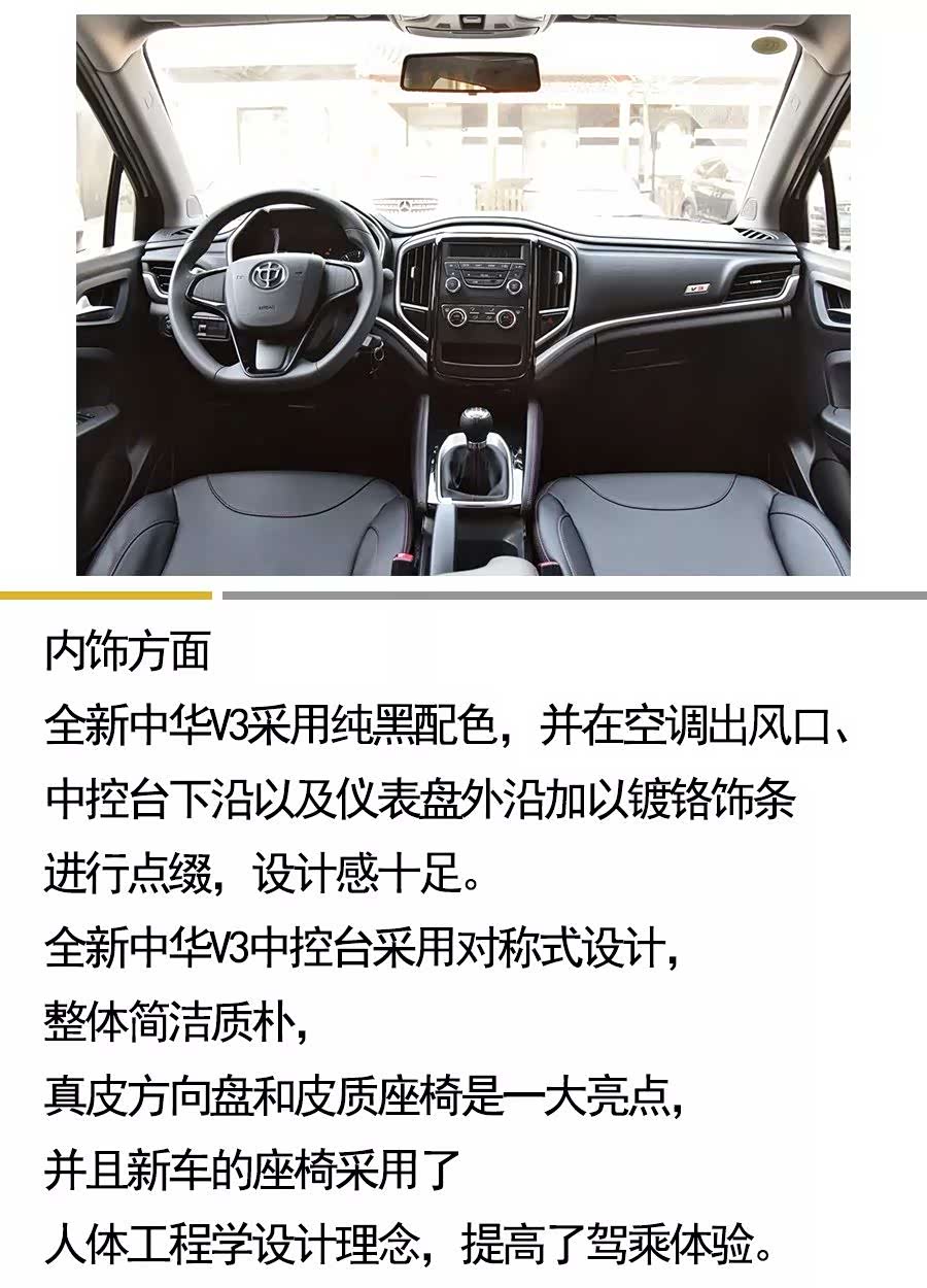 内饰方面,全新中华V3采用纯黑配色,并在空调出风口、中控台下沿以及仪表盘外沿加以镀铬饰条进行点缀,设计感十足。全新中华V3中控台采用对称式设计,整体简洁质朴,真皮方向盘和皮质座椅是一大亮点,并且新车的座椅采用了人体工程学设计理念,提高了驾乘体验。