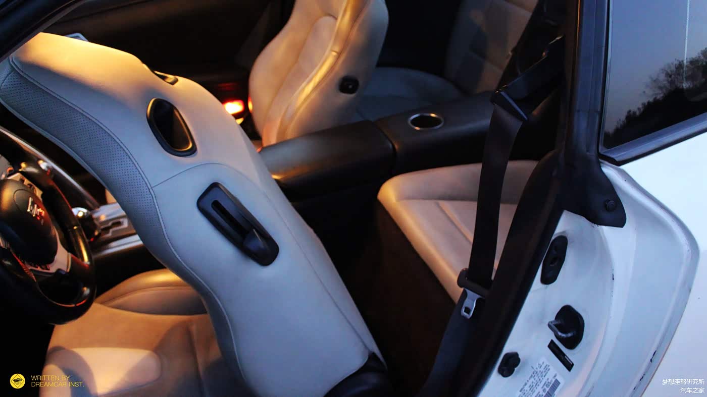 GTR的座椅,很有赛车的风格,近似桶椅的设计,加上两种皮革材质的拼贴,营造出强烈的运动感,静态的乘坐体验良好,就是填充物太硬,上面说到车子的底盘非常硬,这样最后一道过滤的效果也减弱了,日常的舒适性几乎是崩溃的。