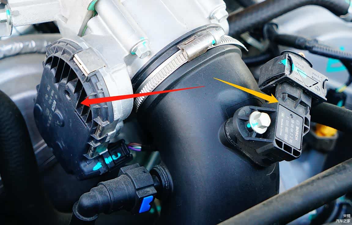 上图为进气歧管前端的全部由博世提供的节流阀体(红色箭头)和进气压力传感器(黄色箭头)细节特写。