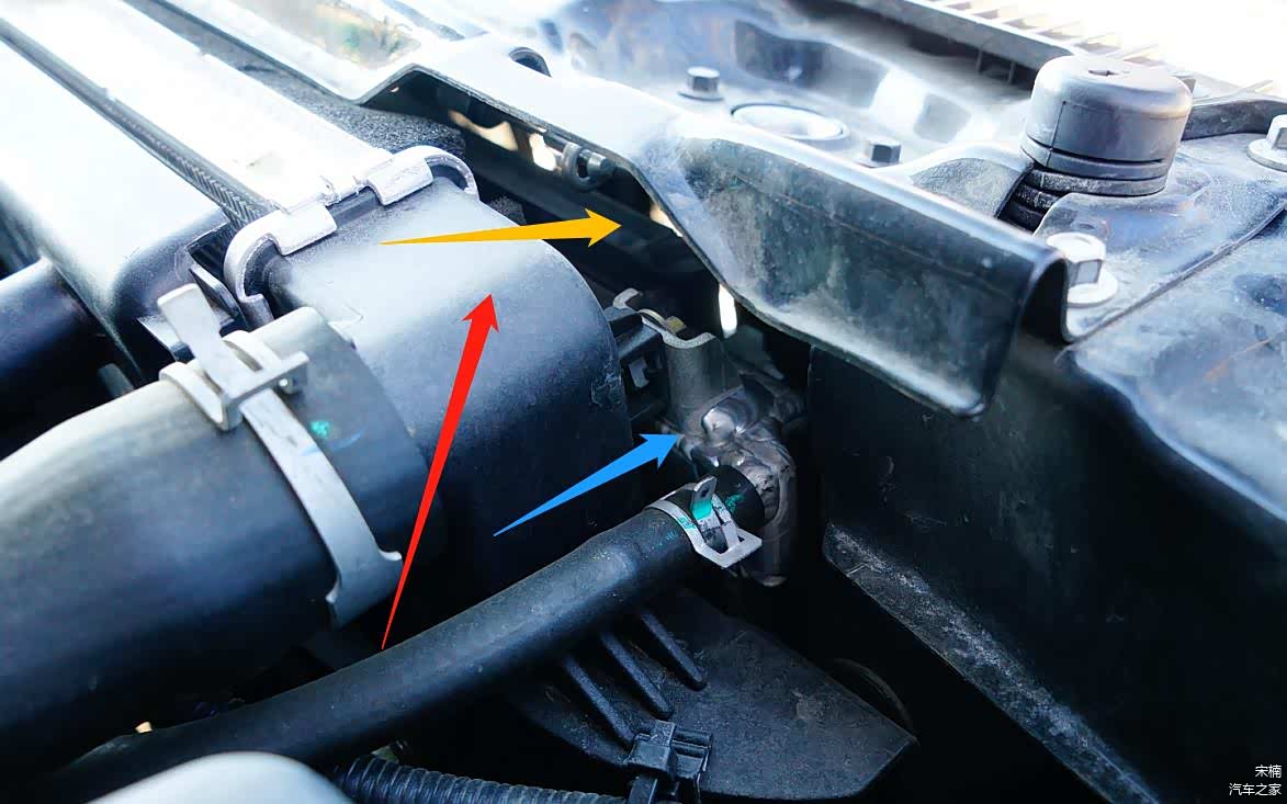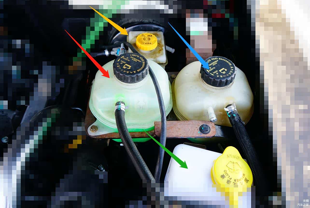 黄色箭头:制动总泵带真空助力器上的制动液补液壶