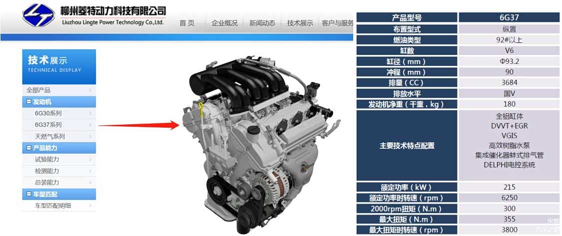菱特6G3X系列“V6 3.0T”发动机,进气歧管为ABS工程塑料并具备DVVT功能、电控系统由德尔福提供;