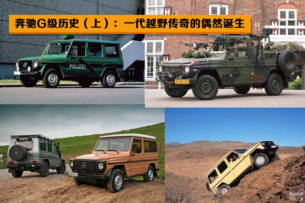 故事开端要从1972年讲起,这一年奔驰与斯太尔(对,就是那个卡车品牌,斯太尔到如今仍旧是越野车底盘领域的专家)开始了奔驰G级的研发工作,奔驰G级最初的研发方向是“在极其恶劣路况下工作的客/货车”,可见最初奔驰G级并没有把自己定义为越野车,而是商用的客货车。1973年,奔驰G级的第一辆测试车装配成功,非承载式车身+分时四驱,新车在1974年完成了各种测试,测试的环境很严苛,撒哈拉、北极圈、煤矿都有奔驰G级的身影,可惜的是当年对于这种车型的需求并不大,没有开始量产。直到1975年伊朗国王为了装备军工产业,下单订购了2万辆奔驰G,才让这款车型得以复活,这在当时是一个很庞大的订单,加上之前在越野车领域的摸索,奔驰重新调整了生产策略,开始着手建立生产线。坑爹的是,1979年1月伊朗国王的巴列维政权被推翻,新政府取消了之前的军用订单,但是奔驰G级在1979年已经开始量产了,1979年也是大家比较认同的奔驰G级初代车型的年份。
