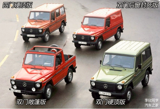 车身尺寸方面,W460系列的奔驰G级提供短轴版和长轴版两种轴距,短轴版车型轴距为2400mm,长轴版车型轴距为2850mm。根据不同的使用需求,车身形式又分为双门敞篷、双门硬顶、四门硬顶以及箱货版。