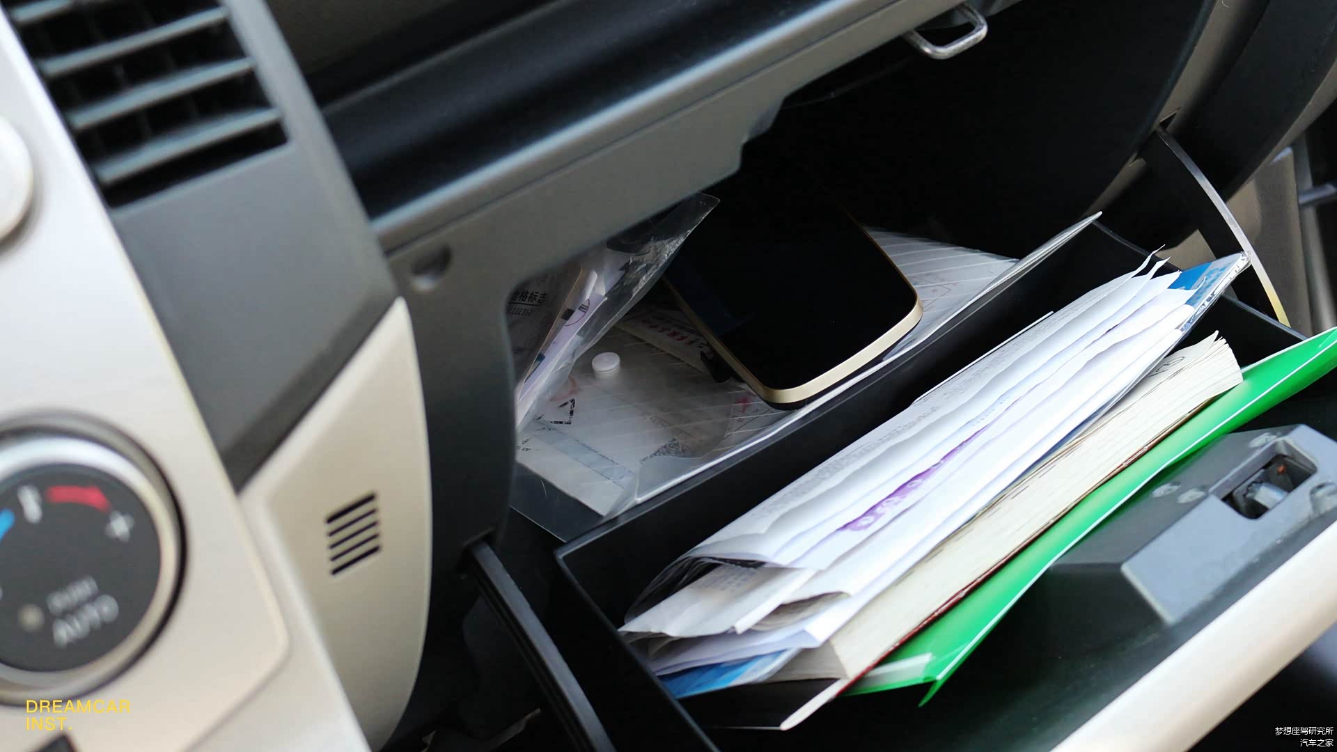 上方还有个储物槽,这里可以放置一些随手要用的东西,主驾驶一边也有,不过尺寸很小,放不下手机。