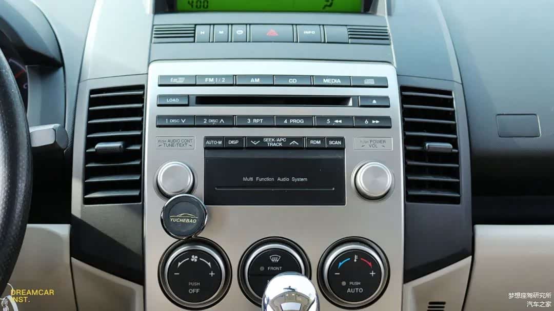 中控台功能区布局对称而工整,强迫症患者的福音(忽略手机支架,想扔掉的,但发现前车主还留了个磁吸片,过于贴心,留着吧),上面行车电脑显示屏,中间是六碟CD多媒体,下面是自动空调,看着简陋但配置还是挺有料的。