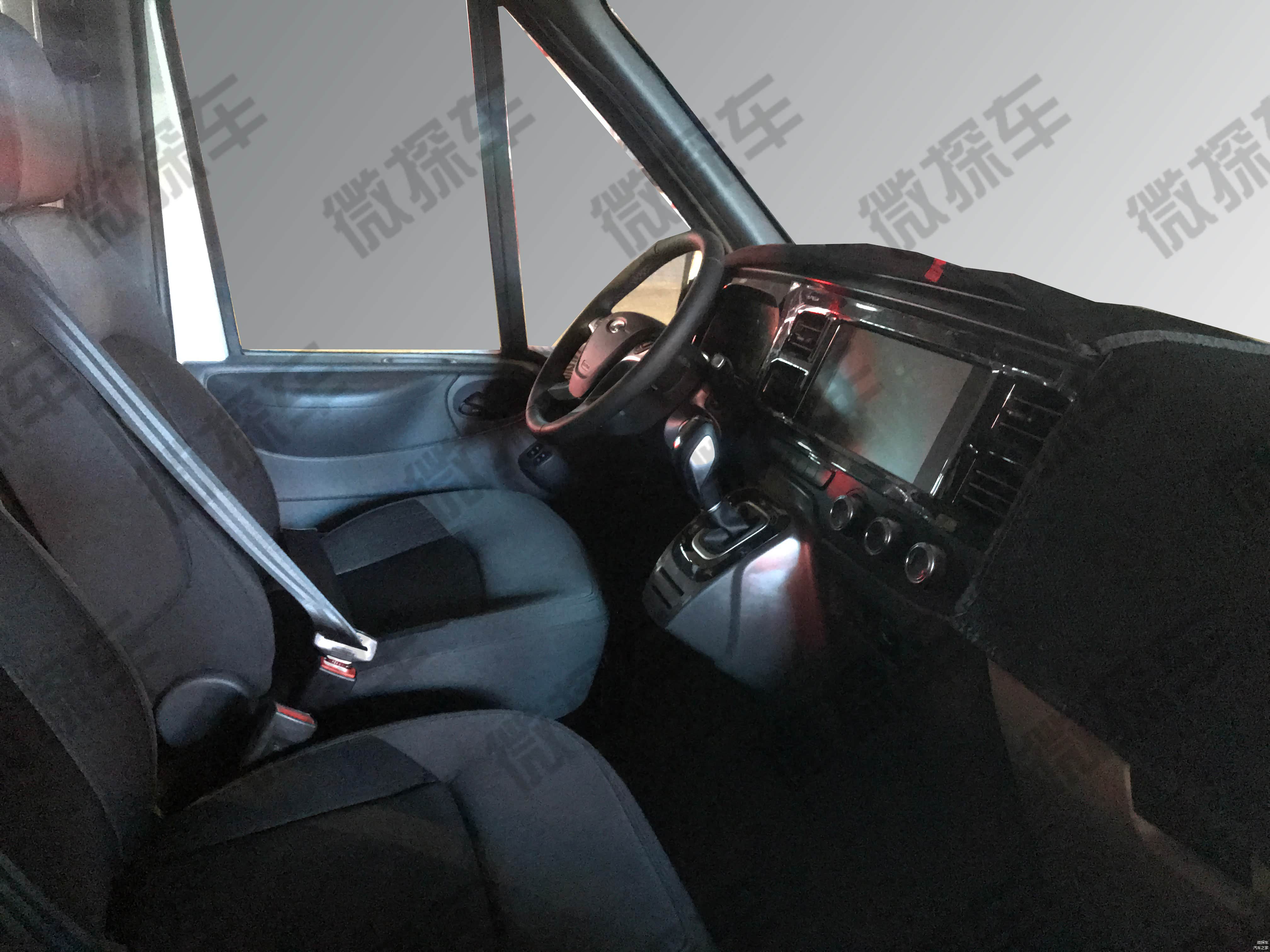 内饰方面,中控区域与现款有着很大区别,配备了一块大尺寸的液晶屏幕,左右两边为四个正方形的空调出风口,相比现款,下方的空调控制旋钮位置没有改变,物理按键大幅度减少,仅在旋钮左面保留了一排,采用多功能方向盘,与江铃福特自家途睿欧所使用的一样,根据测试车的档把来看,该车为自动挡车型,副驾驶一侧的中控台进行了遮挡,目前还未得到其他信息,我们会持续关注。