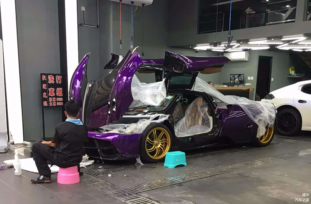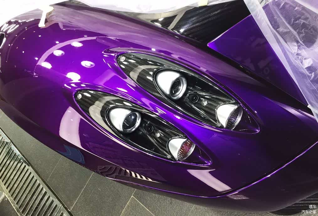 不管是帕加尼风神还是ZONDA,都是定制版本,有自己专属的名字。澳门第一辆,也是目前唯一的一辆自然也有自己的名字,帕加尼ZZJM,中文名称是紫醉金迷。从价格上来说,帕加尼风神到澳门的价格比大陆便宜不少,大概在1700万人民币左右,如果是在大陆地区,不会低于2500万。这是ZZJM刚刚到达澳门时候的样子,施工人员准备给车子贴上车衣。由于它的车身外观是紫色的,轮毂是金色的,有金有紫,紫醉金迷再适合它不过了。