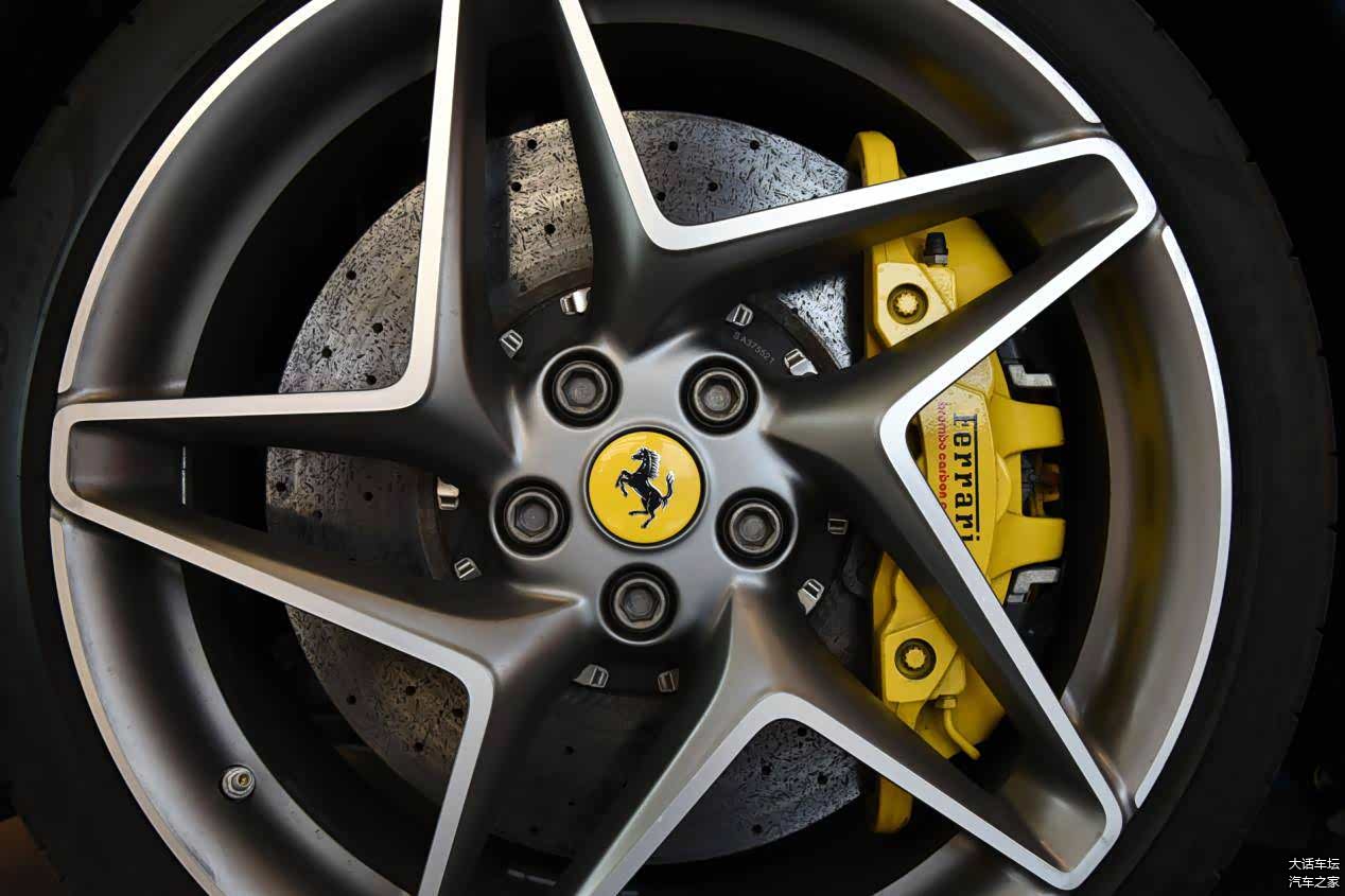 大五星造型的20英寸轮毂很有法拉利的那种传统味道,无论是曾经的法拉利Tsetarossa还是法拉利612这样的旗舰车型都使用了这种风格的轮毂,风格很法拉利。245/35 ZR20的前胎和305/30 ZR30的后胎都暗示了疯狂的性能。把20英寸轮毂塞满的碳陶刹车盘保证了这匹烈马可以飞奔起来也能稳稳的停住,另外20英寸的碳纤维轮毂也被列入了法拉利F8的选装包中。与性能挂钩的东西,没点碳纤维还真不行。
