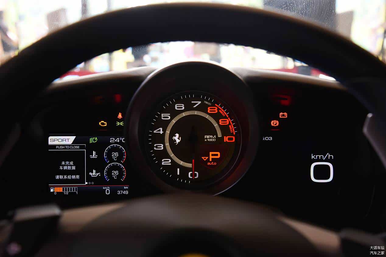 方向盘毋庸置疑是标准的法拉利风格,造型战斗并且结构非常复杂,方向盘上整合了大量的功能控制机构,甚至转向灯和雨刷控制也被整合在了方向盘上,气囊盖左下角的红色按钮和右下角的红色旋钮分别是启动按键和驾驶模式选择,让你双手完全不用离开方向盘就可以控制一切功能。