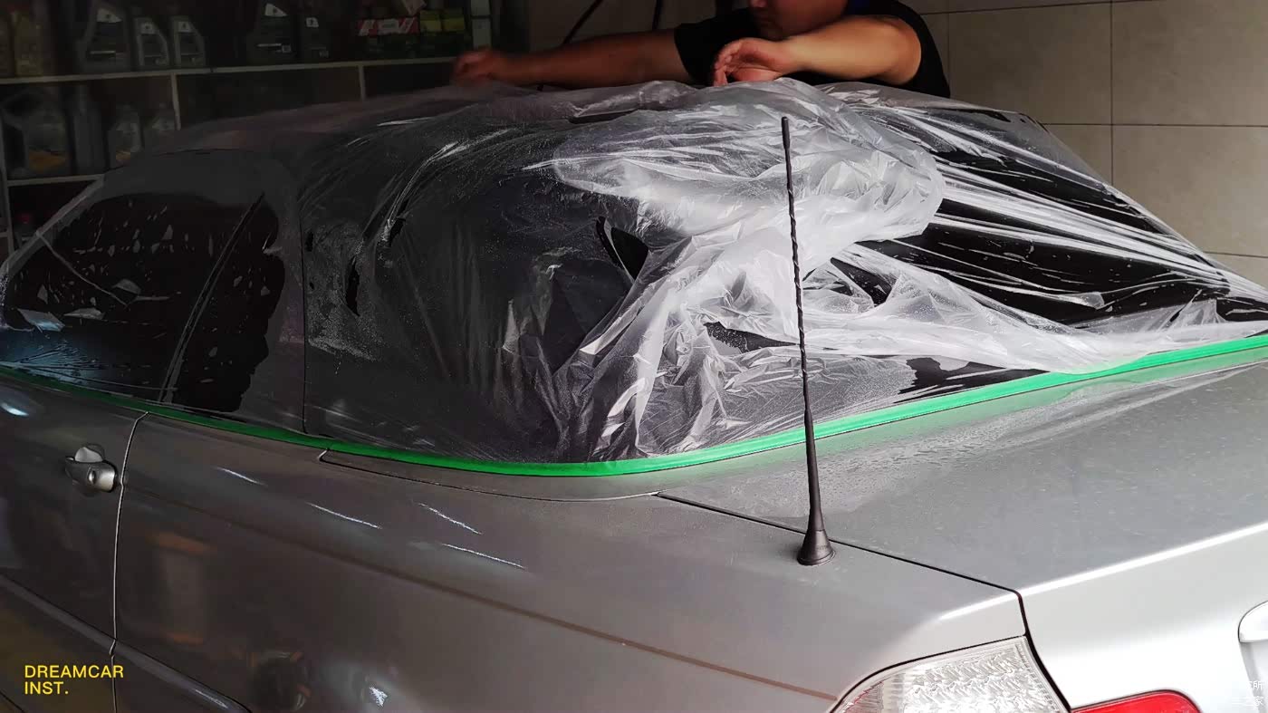 这辆车的油漆成色还不错,抛光打蜡以后,光泽恢复的更好一些,为了防止抛光蜡和粉末污染,顶棚需要先保护起来。